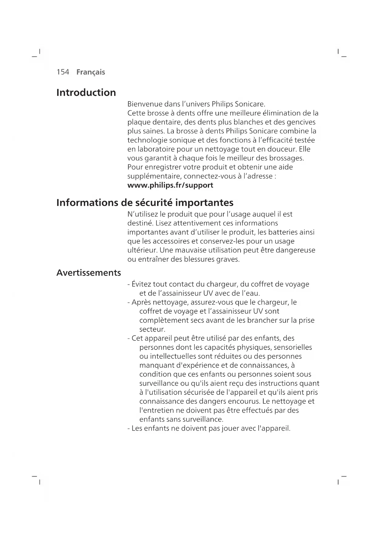 Français Introduction Bienvenue dans l’univers Philips Sonicare. Cette brosse à dents offre une meilleure élimination de la plaque dentaire, des dents plus blanches et des gencives plus saines. La brosse à dents Philips Sonicare combine la technologie sonique et des fonctions à l’efficacité testée en laboratoire pour un nettoyage tout en douceur. Elle vous garantit à chaque fois le meilleur des brossages. Pour enregistrer votre produit et obtenir une aide supplémentaire, connectez-vous à l’adresse: www.philips.fr/support Informations de sécurité importantes N’utilisez le produit que pour l’usage auquel il est destiné. Lisez attentivement ces informations importantes avant d’utiliser le produit, les batteries ainsi que les accessoires et conservez-les pour un usage ultérieur. Une mauvaise utilisation peut être dangereuse ou entraîner des blessures graves. Avertissements - Évitez tout contact du chargeur, du coffret de voyage et de l’assainisseurUV avec de l’eau. - Après nettoyage, assurez-vous que le chargeur, le coffret de voyage et l’assainisseurUV sont complètement secs avant de les brancher sur la prise secteur. - Cet appareil peut être utilisé par des enfants, des personnes dont les capacités physiques, sensorielles ou intellectuelles sont réduites ou des personnes manquant d'expérience et de connaissances, à condition que ces enfants ou personnes soient sous surveillance ou qu'ils aient reçu des instructions quant à l'utilisation sécurisée de l'appareil et qu'ils aient pris connaissance des dangers encourus. Le nettoyage et l'entretien ne doivent pas être effectués par des enfants sans surveillance. - Les enfants ne doivent pas jouer avec l'appareil.155 Français - Utilisez exclusivement des accessoires ou des consommables de la marque Philips. Utilisez uniquement le câbleUSB et le bloc d’alimentationUSB d’origine (s’ils sont fournis). - Cet appareil ne contient aucune pièce réparable par l’utilisateur. Si l’appareil est endommagé, cessez de l’utiliser et contactez le Service Consommateurs de votre pays (voir «Garantie et assistance»). - Si le câble USB ou le bloc d’alimentationUSB est endommagé, cessez de l’utiliser. - N’utilisez pas le chargeur, le coffret de voyage et/ou l’assainisseurUV à l’extérieur ou près de surfaces chauffantes. - Ne nettoyez aucune pièce du produit au lave-vaisselle. - Cet appareil a été conçu uniquement pour le brossage des dents, des gencives et de la langue. - Tenez toujours l’assainisseurUV hors de portée des enfants. - Cessez d’utiliser l’assainisseurUV si le voyant/l’ampouleUV reste allumé(e) lorsque l’assainisseurUV est ouvert. Les UV peuvent être dangereux pour les yeux et la peau. - Utilisez l’assainisseur uniquement avec l’écran de protection. - Ne touchez pas l’ampouleUV de l’assainisseur UV lorsqu’elle est chaude. - Cessez d’utiliser une tête de brosse dont les brins sont écrasés ou tordus. Remplacez la tête de brosse tous les 3mois ou plus tôt si vous constatez des signes d’usure. - Evitez tout contact direct avec des produits qui contiennent des huiles essentielles ou de l'huile de coprah. Ce contact peut déloger les brins de la brosse à dents. - L’altitude d’utilisation maximale est de 4500mètres. MISES EN GARDE D’ORDRE MÉDICAL - Cessez d’utiliser l’appareil et consultez votre dentiste/médecin en cas de saignement excessif après utilisation, si le saignement persiste après une semaine d’utilisation ou si vous ressentez une gêne ou une douleur.156 Français - Si vous avez reçu des soins bucco-dentaires, notamment au niveau des gencives, au cours des deux derniers mois, consultez votre dentiste avant d'utiliser cet appareil. - Si vous portez un stimulateur cardiaque ou tout autre dispositif implanté, consultez votre médecin ou le fabricant de votre dispositif avant d’utiliser cet appareil. - Si vous avez des problèmes de santé, consultez votre médecin avant d'utiliser cet appareil. - Cet appareil de soins est personnel et n’est pas destiné à être utilisé sur plusieurs patients dans les cabinets ou établissements dentaires. Consignes de sécurité sur la batterie - Cet appareil contient des piles qui ne peuvent être remplacées que par des personnes qualifiées. - N’utilisez le produit que pour l’usage auquel il est destiné. Lisez attentivement ces renseignements avant d’utiliser le produit, sa batterie et ses accessoires, et conservez-les pour un usage ultérieur. Une mauvaise utilisation peut être dangereuse ou entraîner des blessures graves. Les accessoires fournis peuvent varier selon le produit. - N’utilisez que des accessoires et des consommables Philips d’origine. Utilisez uniquement le bloc d’alimentation amovible TCBxxxx (valeurs nominales d’entrée: 100 - 240V~; 50/60Hz; 1,5W), HX6100 (valeurs nominales d’entrée: 100 - 240V~; 50/60Hz; 1,4W), HX6110 (valeurs nominales d’entrée: 100 - 240V~; 50/60Hz; 1,5W), HX6160 (valeurs nominales d’entrée: 100 - 240V~; 50/60Hz; 6W), WAAxxxx (valeurs nominales d’entrée: 100 - 240V~; 50/60Hz; 3,5W). - Tenez le produit et les piles à l’abri du feu et ne les exposez pas directement aux rayons du soleil ou à des températures élevées. - Si le produit devient anormalement chaud, dégage une odeur, change de couleur ou si la charge prend plus de temps que d’habitude, cessez d’utiliser et de charger le produit et contactez Philips.157 Français - Ne placez pas les produits et leurs piles dans un four à micro-ondes ou sur une table de cuisson à induction. - Afin d’éviter que les piles ne surchauffent ou ne dégagent des substances toxiques ou dangereuses, le produit et les piles ne doivent pas être ouverts, modifiés, percés, endommagés ou démontés. Les piles ne doivent pas être court-circuitées ou surchargées et leur polarité ne doit pas être inversée. - Cet appareil contient une batterie non remplaçab