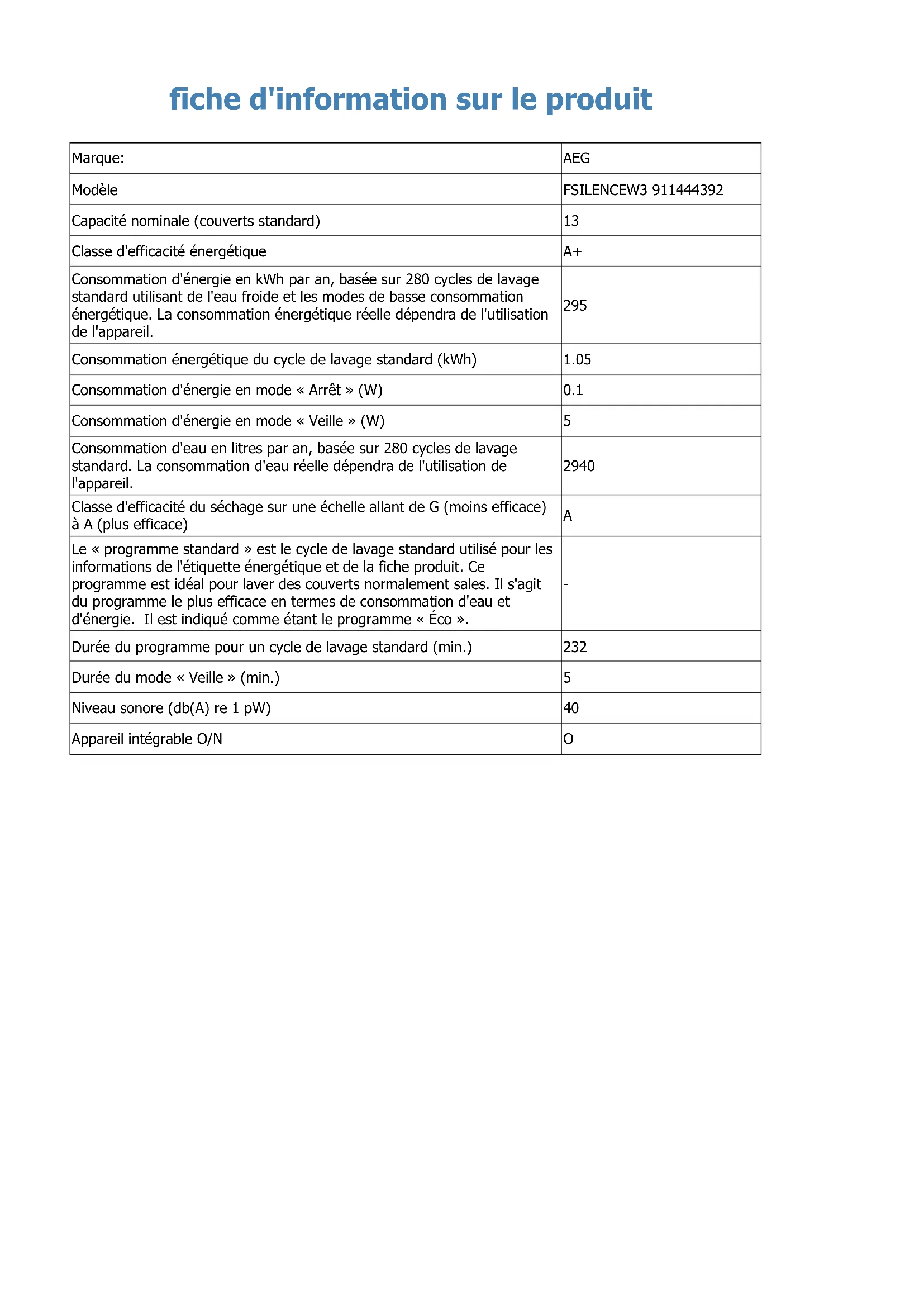 Marque: AEG Modèle FSILENCEW3 911444392 Capacité nominale (couverts standard)