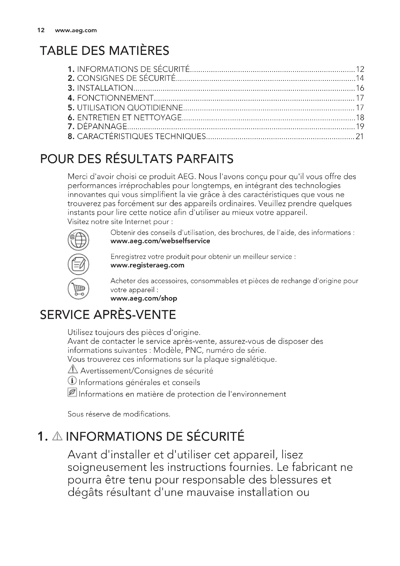 Avant d'installer et d'utiliser cet appareil, lisez soigneusement les instructions fournies. Le fabricant ne pourra être tenu pour responsable des blessures et dégâts résultant d'une mauvaise installation ou www.aeg.com 12utilisation. Conservez toujours les instructions dans un lieu sûr et accessible pour vous y référer ultérieurement.