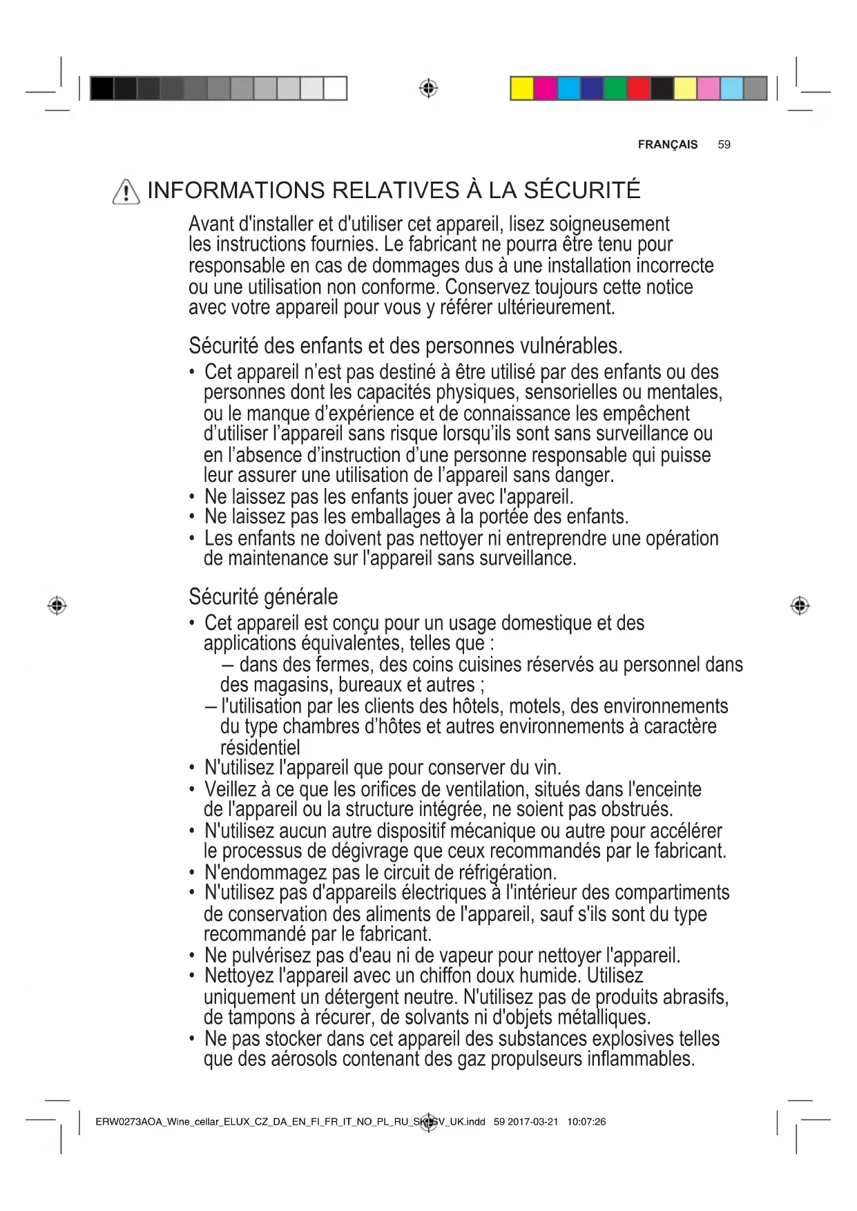TABLEDESMATIÈRES ERW0273AOA_Wine_cellar_ELUX_CZ_DA_EN_FI_FR_IT_NO_PL_RU_SK_SV_UK.indd 58 2017-03-21 10:07:2659 FRANÇAIS Avant d'installer et d'utiliser cet appareil, lisez soigneusement les instructions fournies. Le fabricant ne pourra être tenu pour responsable en cas de dommages dus à une installation incorrecte ou une utilisation non conforme. Conservez toujours cette notice avec votre appareil pour vous y référer ultérieurement. Sécurité des enfants et des personnes vulnérables.