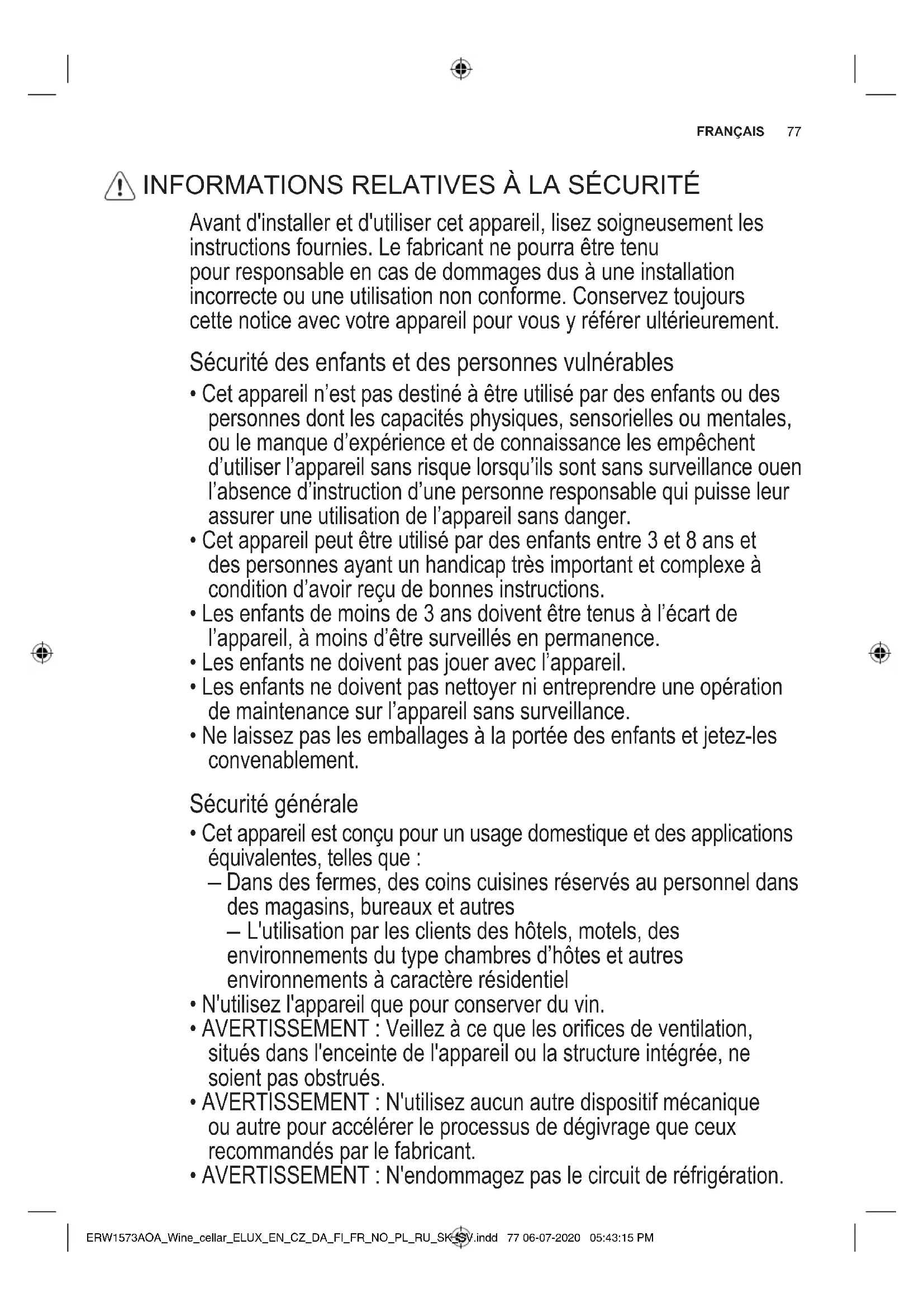 Utiliseztoujoursdespiècesderechanged’origine. Avantdevousadresseràuncentredeserviceaprès-venteagréé,assurez-vousde disposerdesinformationssuivantes:Modèle,PNC,numérodesérie. Lesinformationssetrouventsurlaplaquesignalétique. Avertissement/Miseengarde-Informationdesécurité Informationsgénéralesetastuces Informationsenvironnementales Sousréservedemodicationssanspréavis. ERW1573AOA_Wine_cellar_ELUX_EN_CZ_DA_FI_FR_NO_PL_RU_SK_SV.indd 76 06-07-2020 05:43:15 PM77 FRANÇAIS Avant d'installer et d'utiliser cet appareil, lisez soigneusement les instructions fournies. Le fabricant ne pourra être tenu pour responsable en cas de dommages dus à une installation incorrecte ou une utilisation non conforme. Conservez toujours cette notice avec votre appareil pour vous y référer ultérieurement. Sécurité des enfants et des personnes vulnérables