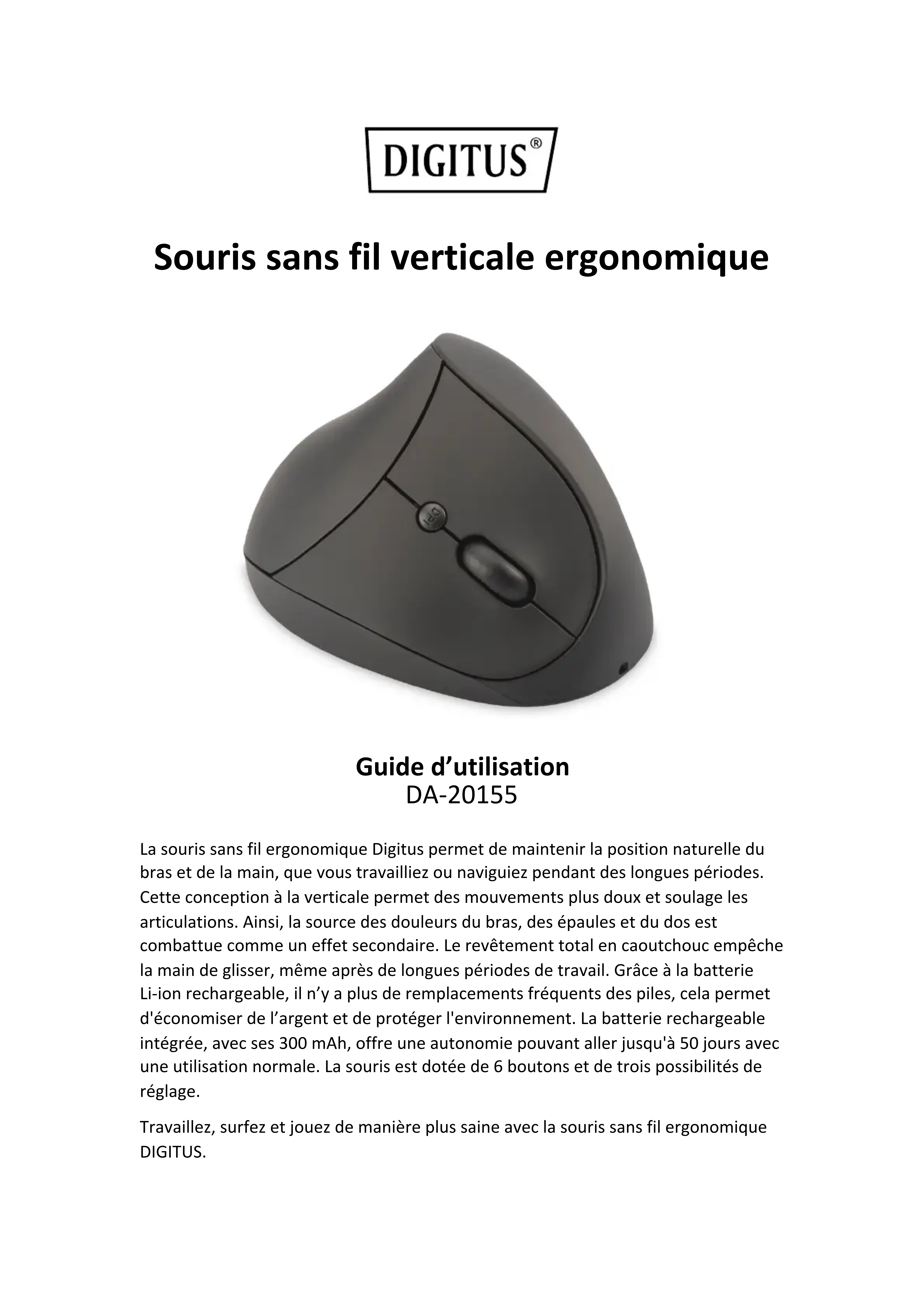 La souris sans fil ergonomique Digitus permet deMAINIR la position naturelle du bras et de la main, que vous travailliez ou naviguiez pendant des longues périodes. Cette conception à la verticale permet des mouvements plus doux et soulage les articulations. Ainsi, la source des douleurs du bras, des épaules et du dos est combattue comme un effet secondaire. Le revêtement total en caoutchouc empêche la main de glisser, même après de longues périodes de travail. Grace à la batterie Li-ion rechargeable, il n'y a plus de remplacements féquents des piles, cela permet d'économiser de l'argent et de protégger l'environnement. La batterie rechargeable intégrée, avec ses 300 mAh, offre une autonomie pouvant aller jusqu'à 50 jours avec une utilisation normale. La souris est dotée de 6 boutons et de trois possibilés de réglage.