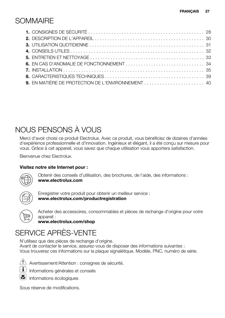 Merci d'avoir choisi ce produit Electrolux. Avec ce produit, vous bénéficiez de dizaines d'années d'expérience professionnelle et d'innovation. Ingénieux et élégant, il a été conçu sur mesure pour vous. Grâce à cet appareil, vous savez que chaque utilisation vous apportera satisfaction.