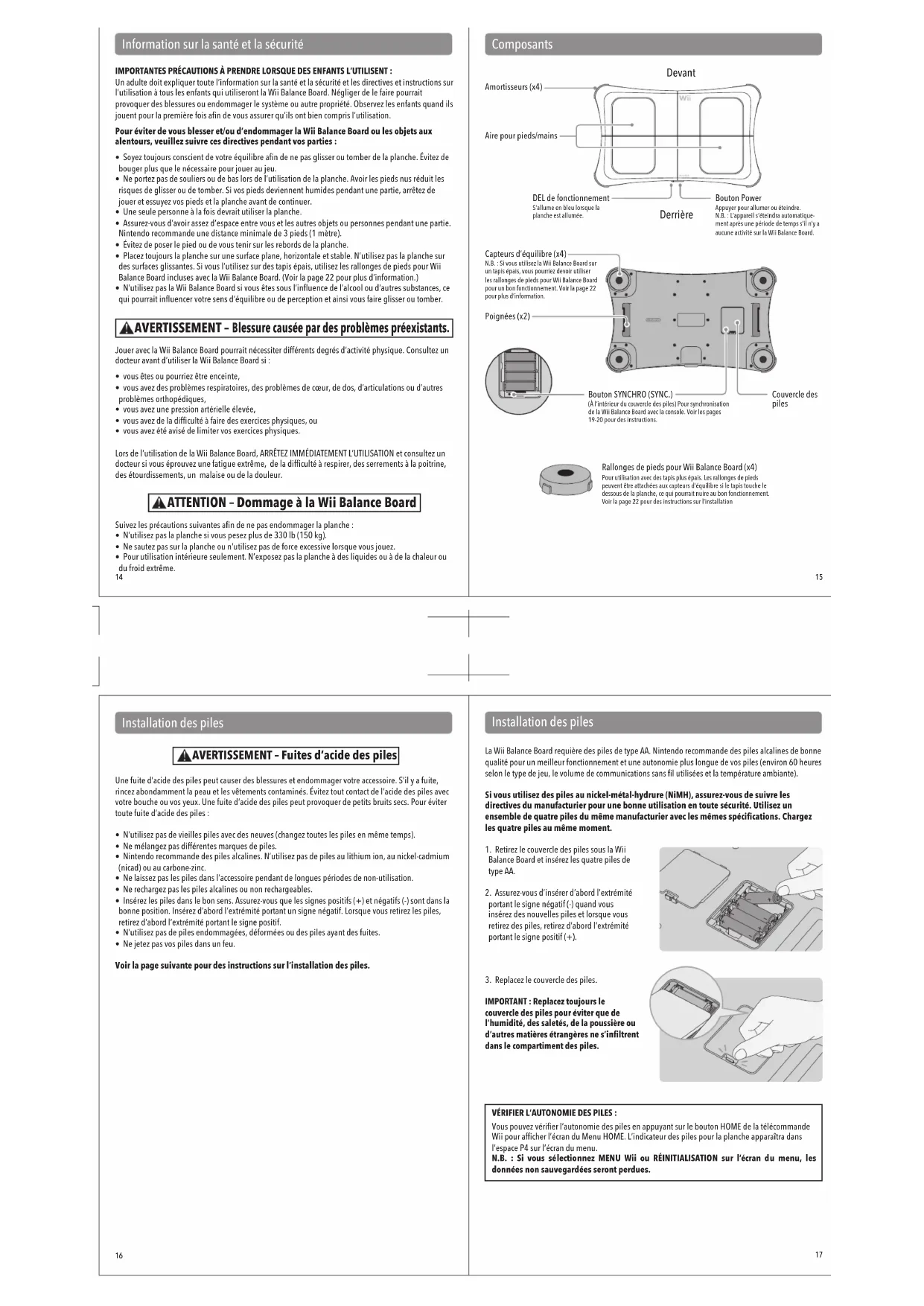 - N’utilisez pas la Wii Balance Board si vous êtes sous l’influence de l’alcool ou d’autres substances, ce qui pourrait influencer votre sens d’équilibre ou de perception et ainsi vous faire glisser ou tomber. Amortisseurs (x4) Capteurs d’équilibre (x4) N.B. : Si vous utilisez la Wii Balance Board sur un tapis épais, vous pourriez devoir utiliser les rallonges de pieds pour Wii Balance Board pour un bon fonctionnement. Voir la page 22 pour plus d’information. Poignées (x2) Couvercle des piles Bouton SYNCHRO (SYNC.) (À l’intérieur du couvercle des piles) Pour synchronisation de la Wii Balance Board avec la console. Voir les pages 19-20 pour des instructions. Aire pour pieds/mains DEL de fonctionnement S’allume en bleu lorsque la planche est allumée. Bouton Power Appuyer pour allumer ou éteindre.N.B. : L’appareil s’éteindra automatique-ment après une période de temps s’il n’y a aucune activité sur la Wii Balance Board. Rallonges de pieds pour Wii Balance Board (x4) Pour utilisation avec des tapis plus épais. Les rallonges de pieds peuvent être attachées aux capteurs d’équilibre si le tapis touche le dessous de la planche, ce qui pourrait nuire au bon fonctionnement. Voir la page 22 pour des instructions sur l’installation Devant Derrière AVERTISSEMENT – Fuites d’acide des piles Installation des piles Composants Une fuite d’acide des piles peut causer des blessures et endommager votre accessoire. S’il y a fuite, rincez abondamment la peau et les vêtements contaminés. Évitez tout contact de l’acide des piles avec votre bouche ou vos yeux. Une fuite d’acide des piles peut provoquer de petits bruits secs. Pour éviter toute fuite d’acide des piles :