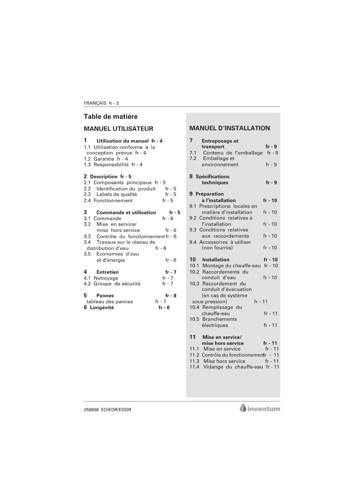 Faites détartrer votre chauffe-eau chaque année si vous habitez dans une région où la dureté de l’eau est élevée (plus de 12 °dH). L’eau d’expansion doit toujours pouvoir s’égoutter hors de la valve de décharge. Dans le cas con traire, la pression dans le chauffe-eau peut devenir excessive.ED/EDR/EDOR 258898 fr - 8 FRANÇAIS 6 Longévité Tous les matériaux utilisés par Inven- tum bv sont exempts de substances qui pourraient polluer l’environnement lors de la mise au rebut et/ou de l’élimination de l’appareil. 5 Pannes Les chauffe-eau Inventum sont fabriqués avec soin pour assurer une grande fiabilité. Si votre chauffe-eau venait quand même à tomber en panne, suivez les indications présentées dans le tableau des pannes (tableau 1). CONTACTE Z VOTRE IN STAL L AT E U R SI VO U S NE RÉUSSISSEZ PAS À REMÉDIER À LA PANNE AU MOYEN DES INSTRUCTIONS FOURNIES!! A cet effet, veillez à disposer des infor- mations suivantes: - nom du produit - numéro de type - numéro de série