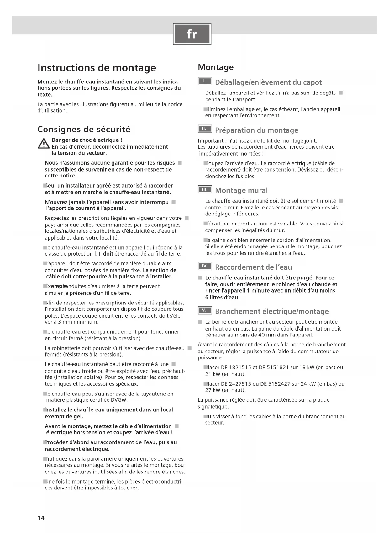 Instructions de montage Montez le chauffe-eau instantané en suivant les indica-tions portées sur les figures. Respectez les consignes du texte.La partie avec les illustrations figurent au milieu de la notice d’utilisation. Consignes de sécurité Danger de choc électrique !En cas d’erreur, déconnectez immédiatement la tension du secteur.Nous n’assumons aucune garantie pour les risques ■susceptibles de survenir en cas de non-respect de cette notice.Seul un installateur agréé est autorisé à raccorder ■et à mettre en marche le chauffe-eau instantané.N’ouvrez jamais l’appareil sans avoir interrompu ■ l’apport de courant à l’appareil.Respectez les prescriptions légales en vigueur dans votre ■pays ainsi que celles recommandées par les compagnies locales/nationales distributrices d’électricité et d’eau et applicables dans votre localité.Le chauffe-eau instantané est un appareil qui répond à la ■ classe de protection I. Il doit être raccordé au fil de terre. L’appareil doit être raccordé de manière durable aux ■conduites d’eau posées de manière fixe. La section de câble doit correspondre à la puissance à installer.Exemple ■ : Les conduites d’eau mises à la terre peuvent simuler la présence d’un fil de terre.Afin de respecter les prescriptions de sécurité applicables, ■l’installation doit comporter un dispositif de coupure tous pôles. L’espace coupe-circuit entre les contacts doit s’éle-ver à 3 mm minimum.Le chauffe-eau est conçu uniquement pour fonctionner ■en circuit fermé (résistant à la pression).La robinetterie doit pouvoir s’utiliser avec des chauffe-eau ■fermés (résistants à la pression).Le chauffe-eau instantané peut être raccordé à une ■conduite d’eau froide ou être exploité avec l’eau préchauf-fée (installation solaire). Pour ce, respecter les données techniques et les accessoires spéciaux.Le chauffe-eau peut s’utiliser avec de la tuyauterie en ■ matière plastique certifiée DVGW.Installez le chauffe-eau uniquement dans un local ■exempt de gel.Avant le montage, mettez le câble d’alimentation ■ électrique hors tension et coupez l’arrivée d’eau !Procédez d’abord au raccordement de l’eau, puis au ■raccordement électrique.Pratiquez dans la paroi arrière uniquement les ouvertures ■nécessaires au montage. Si vous refaites le montage, bou-chez les ouvertures inutilisées afin de les rendre étanches.Une fois le montage terminé, les pièces électroconductri- ■ces doivent être impossibles à toucher. Montage