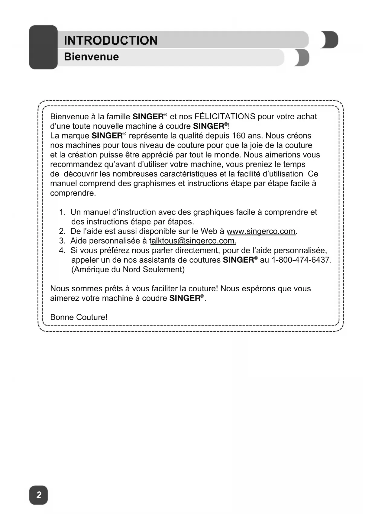 au 1-800-474-6437. (Amérique du Nord Seulement) Nous sommes prêts à vous faciliter la couture! Nous espérons que vous aimerez votre machine à coudre SINGER