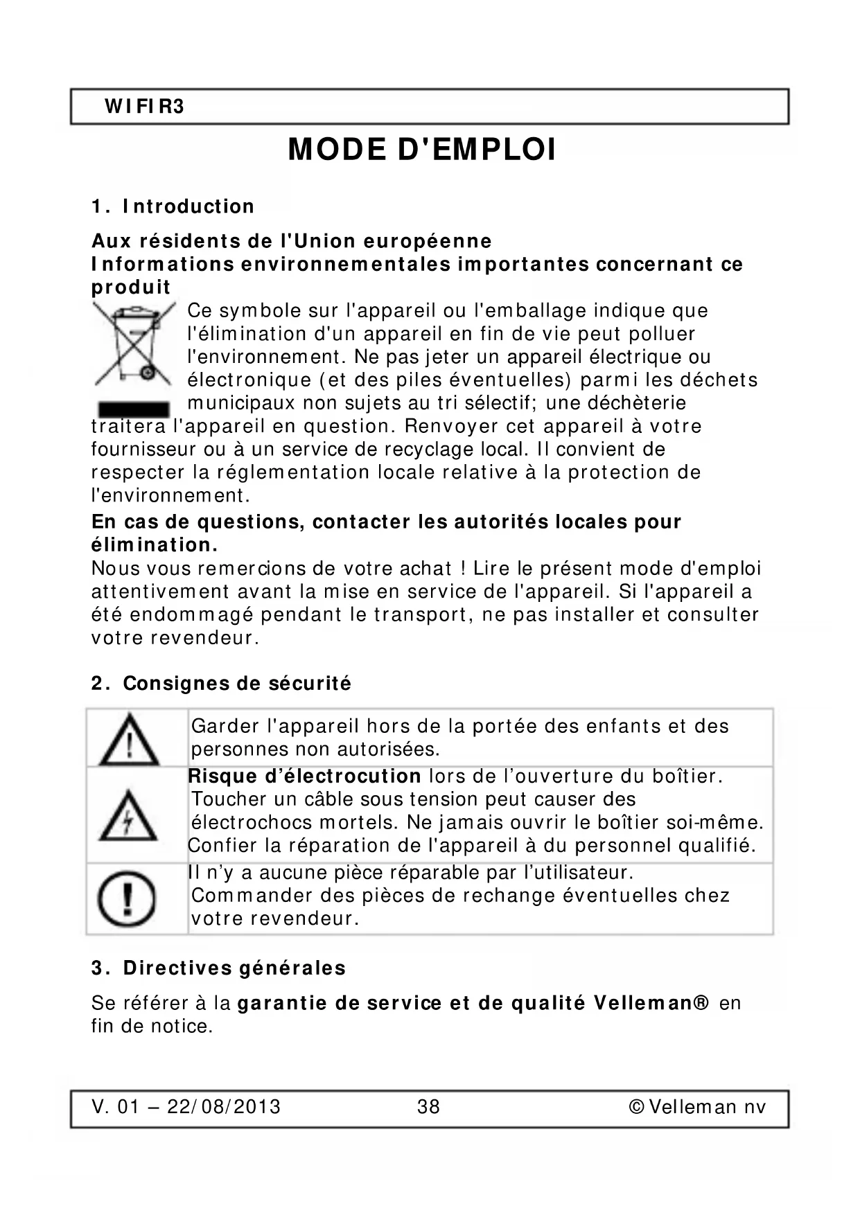 Se référer à la garantie de service et de qualité Velleman® en fin de notice.WIFIR3