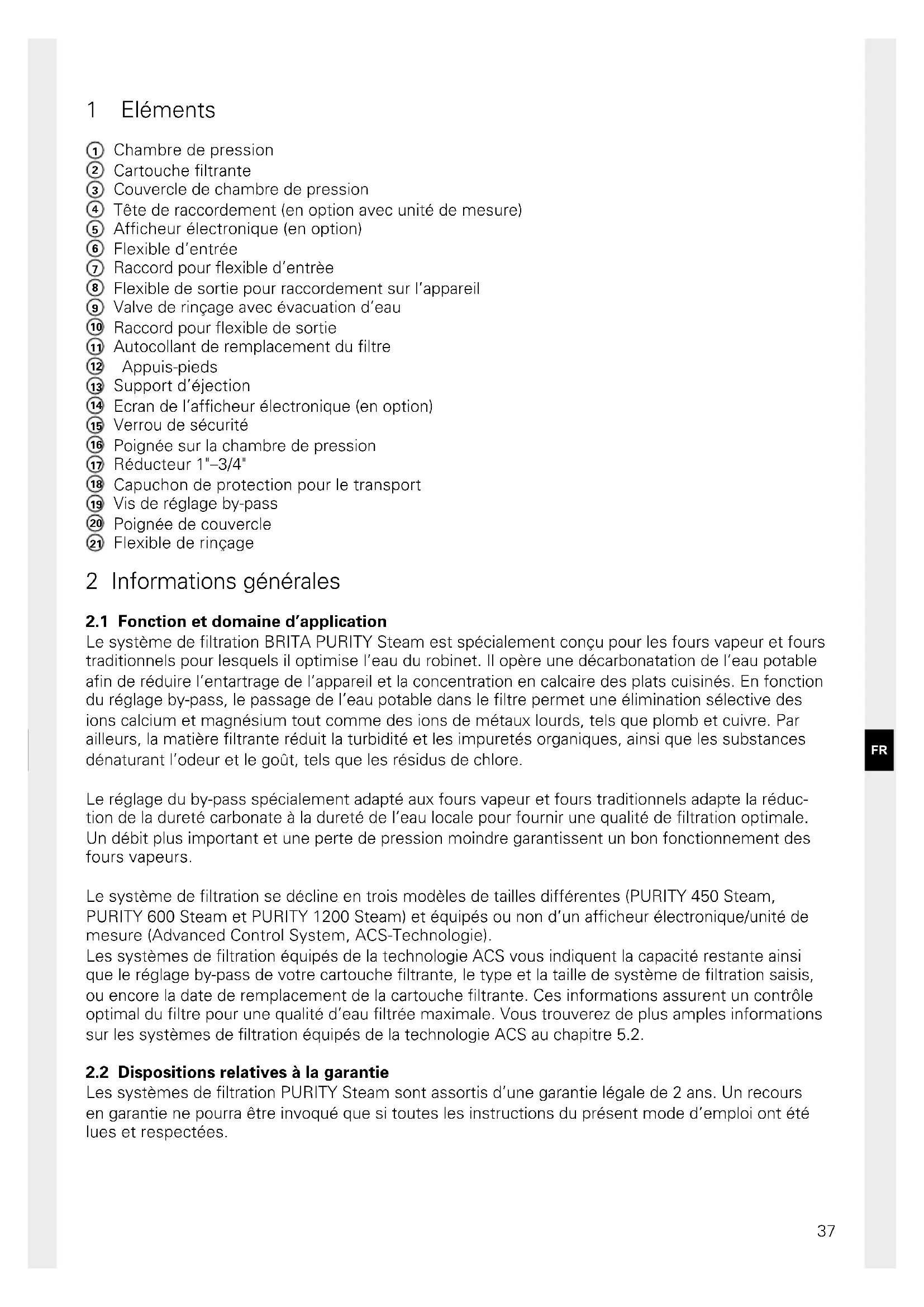 Les systèmes de filtration PURITY Steam sont assortis d’une garantie légale de 2 ans. Un recours en garantie ne pourra être invoqué que si toutes les instructions du présent mode d’emploi ont été lues et respectées. FR38