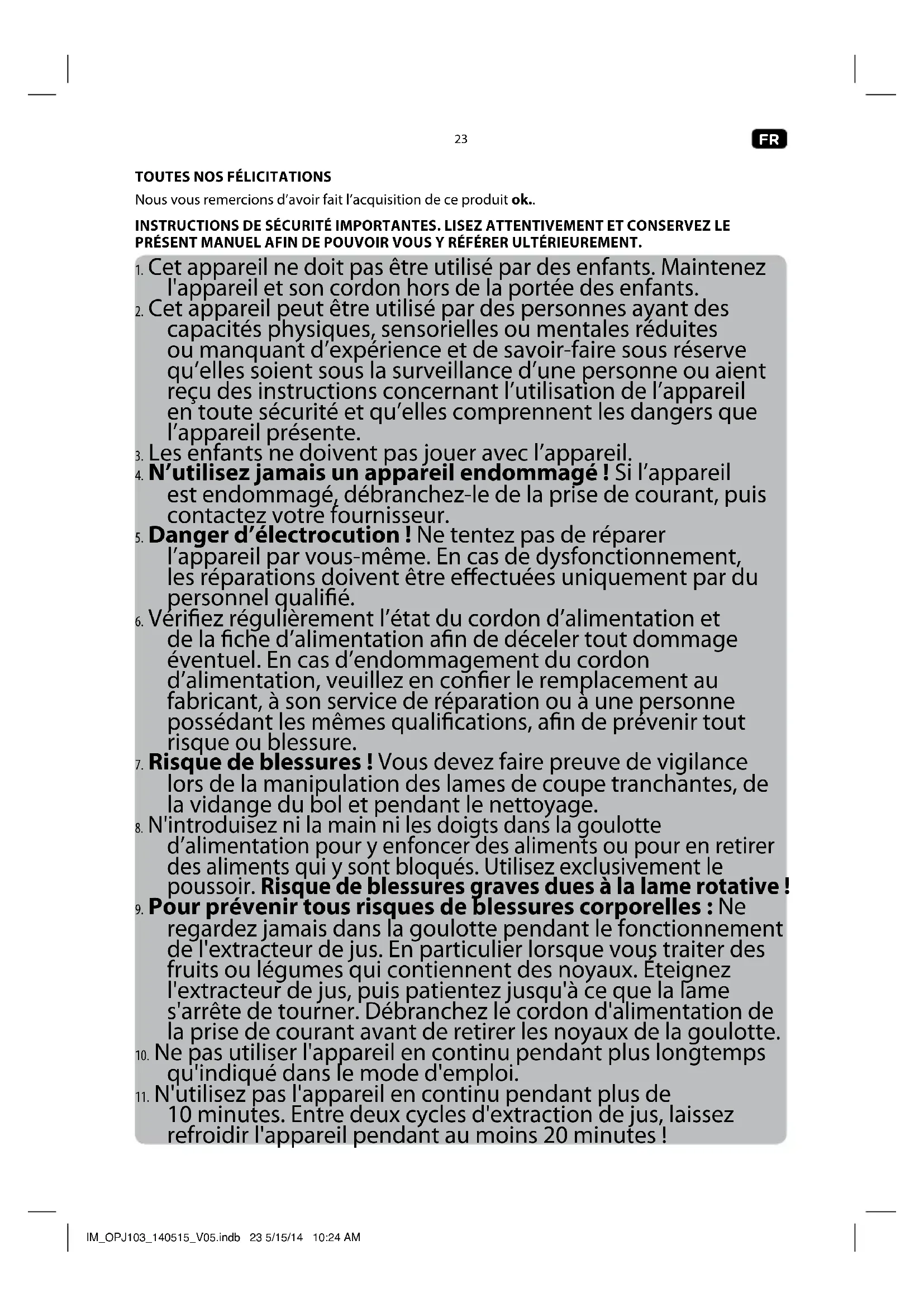 10 minutes. Entre deux cycles d'extraction de jus, laissez refroidir l'appareil pendant au moins 20 minutes ! IM_OPJ103_140515_V05.indb 23 5/15/14 10:24 AM24