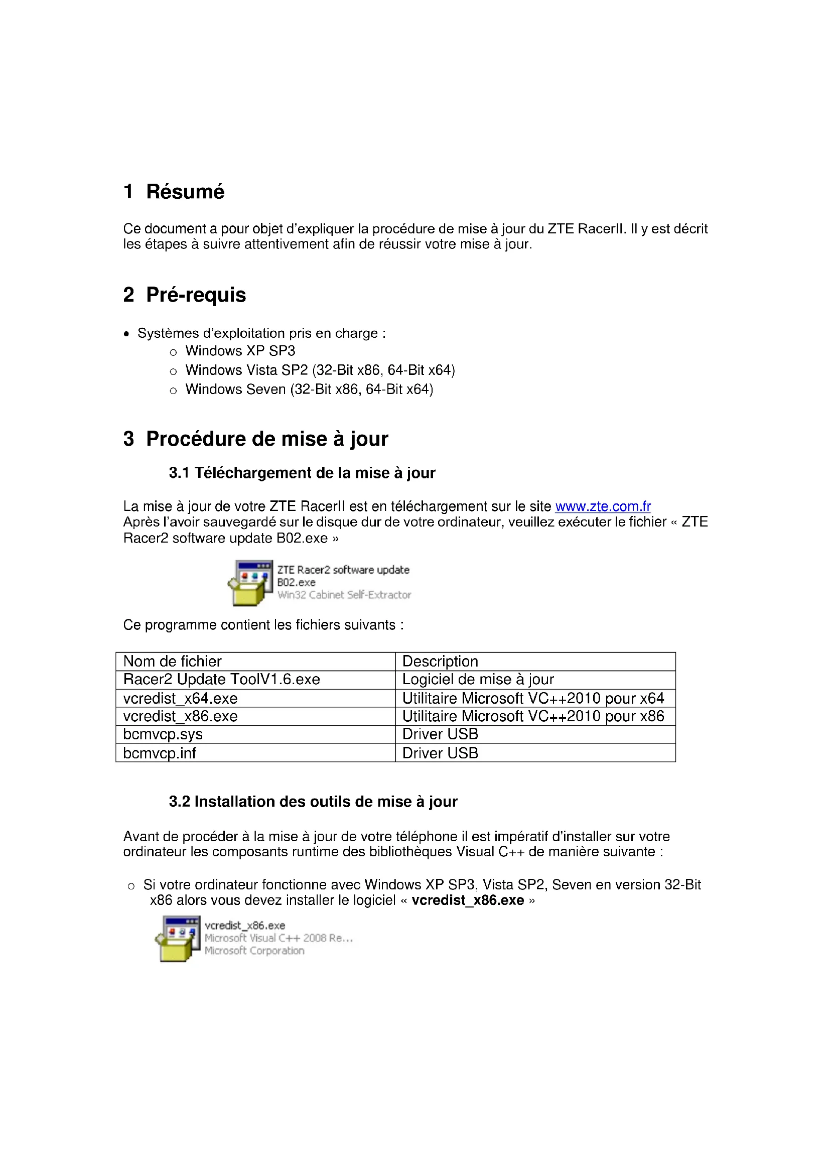 - 3.4 Mise à jour de votre ZTE RacerII Résumé Ce document a pour objet d’expliquer la procédure de mise à jour du ZTE RacerII. Il y est décrit les étapes à suivre attentivement afin de réussir votre mise à jour. 2 Pré-requis Systèmes d’exploitation pris en charge : o Windows XP SP3 o Windows Vista SP2 (32-Bit x86, 64-Bit x64) o Windows Seven (32-Bit x86, 64-Bit x64) 3 Procédure de mise à jour p. 121