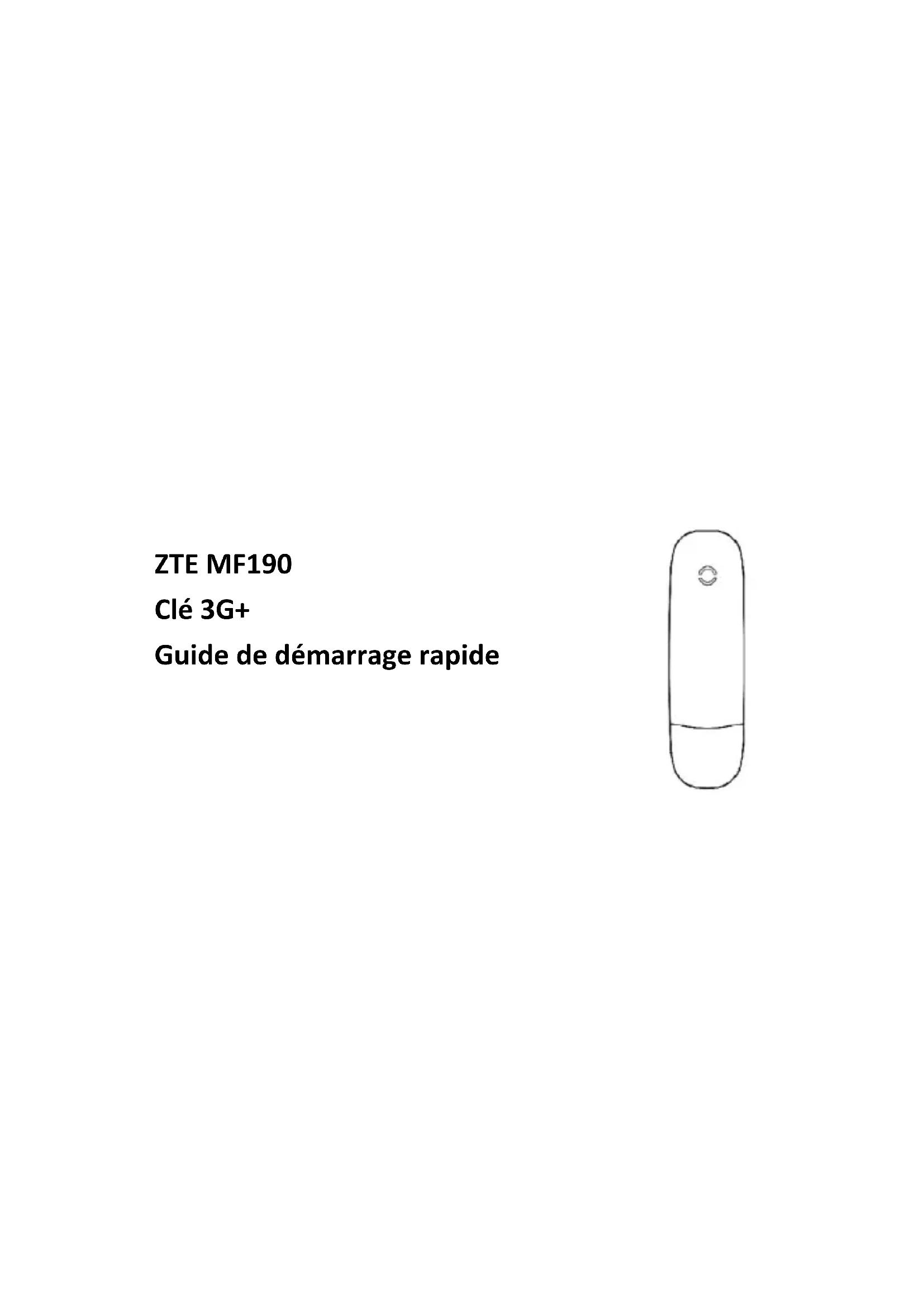 ZTE MF190 Clé 3G+ Guide de démarrage rapideIntroducon La clé 3G+ ZTE MF190 est compable avec les réseaux mobiles 3G HSUPA/HSDPA/UMTS et 2G EDGE/GPRS/GSM. Elle se connecte au port USB de votre ordinateur portable ou de bureau permettant d'accéder facilement à Internet. Vous pouvez également recevoir et envoyer des SMS et vous connecter à tout moment et n'importe où à internet. Spécicaons Le tableau suivant présente les spécicaons de votre produit. Type d’interface USB 2.0 Systèmes pris en charge Compable avec la plupart des types d’ordinateur portable et de bureau. Systèmes d’exploitaon - Windows 7 32 et 64 bits, Windows Vista 32 bits, Windows XP 32 bits - MAC OS version 10.5 et 10.6 1Foncons Envoi/Récepon SMS, service de données, geson d’applicaons, données simultanées, compable avec les cartes Micro-SDTM, etc. Normes de réseau 3G HSUPA/HSDPA/UMTS et 2G EDGE/GPRS/GSM Débit d’émission (max.) HSUPA 5,76 Mbps UL (débit montant) HSDPA 7,2 Mbps DL (débit descendant) Température Stockage : -40°C à +80°C Service : -10°C à +60°C Dimensions 89 mm × 26 mm × 11 mm Poids Environ 26g Capacité microSDTM Supporte une carte microSDTM jusqu’à 32Go 2Présentaon de la clé 3G+ La gure suivante présente la clé 3G+ MF190 à tre d’illustraon uniquement.