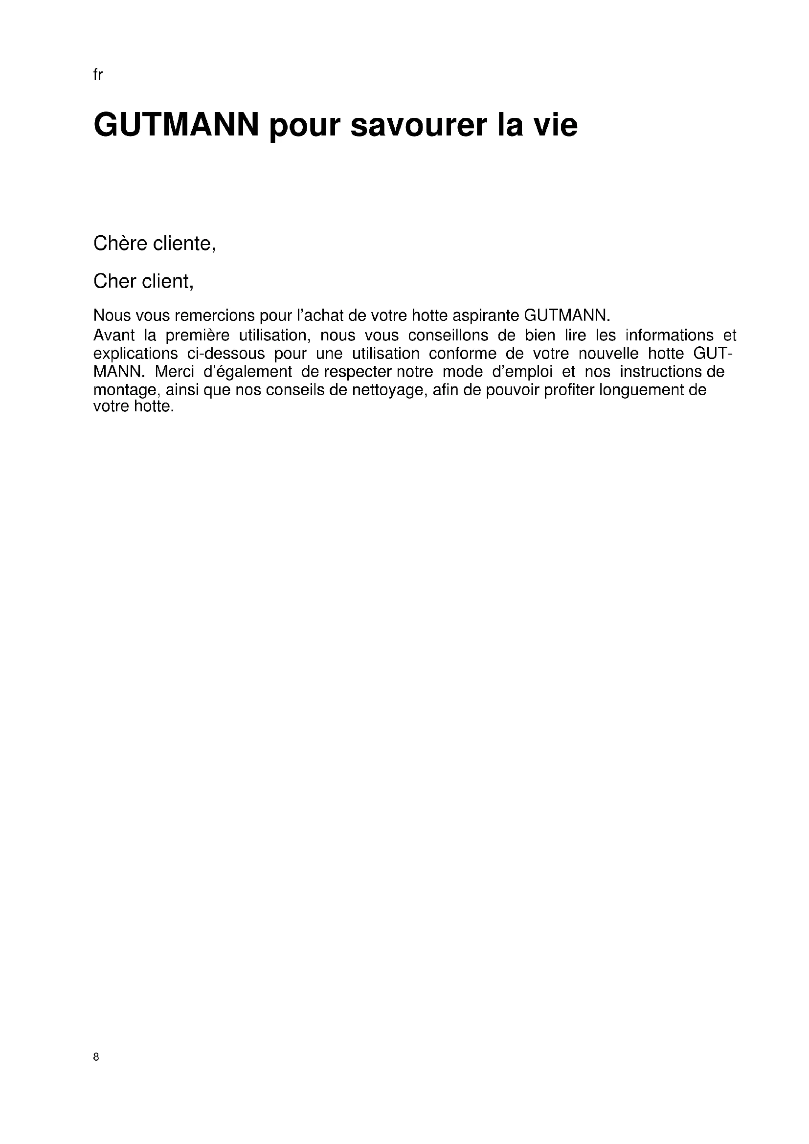 Chère cliente, Cher client, Nous vous remercions pour l’achat de votre hotte aspirante GUTMANN. Avant la première utilisation, nous vous conseillons de bien lire les informations et explications ci-dessous pour une utilisation conforme de votre nouvelle hotte GUT- MANN. Merci d’également de respecter notre mode d’emploi et nos instructions de montage, ainsi que nos conseils de nettoyage, afin de pouvoir profiter longuement de votre hotte.fr