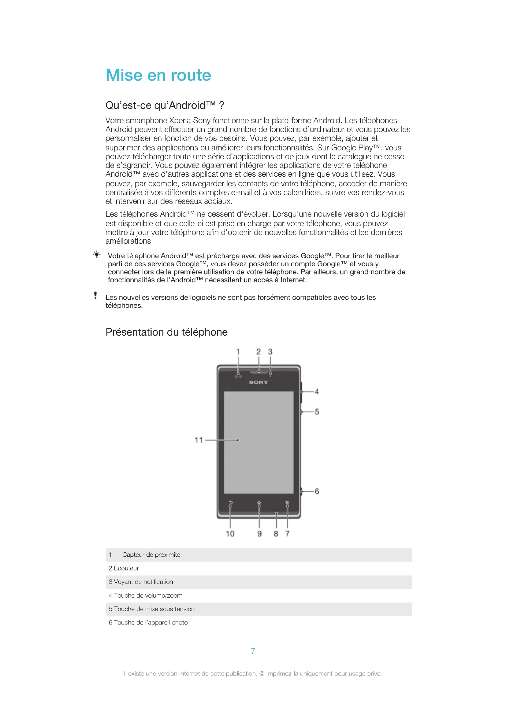 Il existe une version Internet de cette publication. © Imprimez-la uniquement pour usage privé.Mise en route Qu’est-ce qu’Android™ ? Votre smartphone Xperia Sony fonctionne sur la plate-forme Android. Les téléphones Android peuvent effectuer un grand nombre de fonctions d’ordinateur et vous pouvez les personnaliser en fonction de vos besoins. Vous pouvez, par exemple, ajouter et supprimer des applications ou améliorer leurs fonctionnalités. Sur Google Play™, vous pouvez télécharger toute une série d'applications et de jeux dont le catalogue ne cesse de s’agrandir. Vous pouvez également intégrer les applications de votre téléphone Android™ avec d'autres applications et des services en ligne que vous utilisez. Vous pouvez, par exemple, sauvegarder les contacts de votre téléphone, accéder de manière centralisée à vos différents comptes e-mail et à vos calendriers, suivre vos rendez-vous et intervenir sur des réseaux sociaux. Les téléphones Android™ ne cessent d'évoluer. Lorsqu'une nouvelle version du logiciel est disponible et que celle-ci est prise en charge par votre téléphone, vous pouvez mettre à jour votre téléphone afin d'obtenir de nouvelles fonctionnalités et les dernières améliorations. Votre téléphone Android™ est préchargé avec des services Google™. Pour tirer le meilleur parti de ces services Google™, vous devez posséder un compte Google™ et vous y connecter lors de la première utilisation de votre téléphone. Par ailleurs, un grand nombre de fonctionnalités de l'Android™ nécessitent un accès à Internet. Les nouvelles versions de logiciels ne sont pas forcément compatibles avec tous les téléphones. Présentation du téléphone