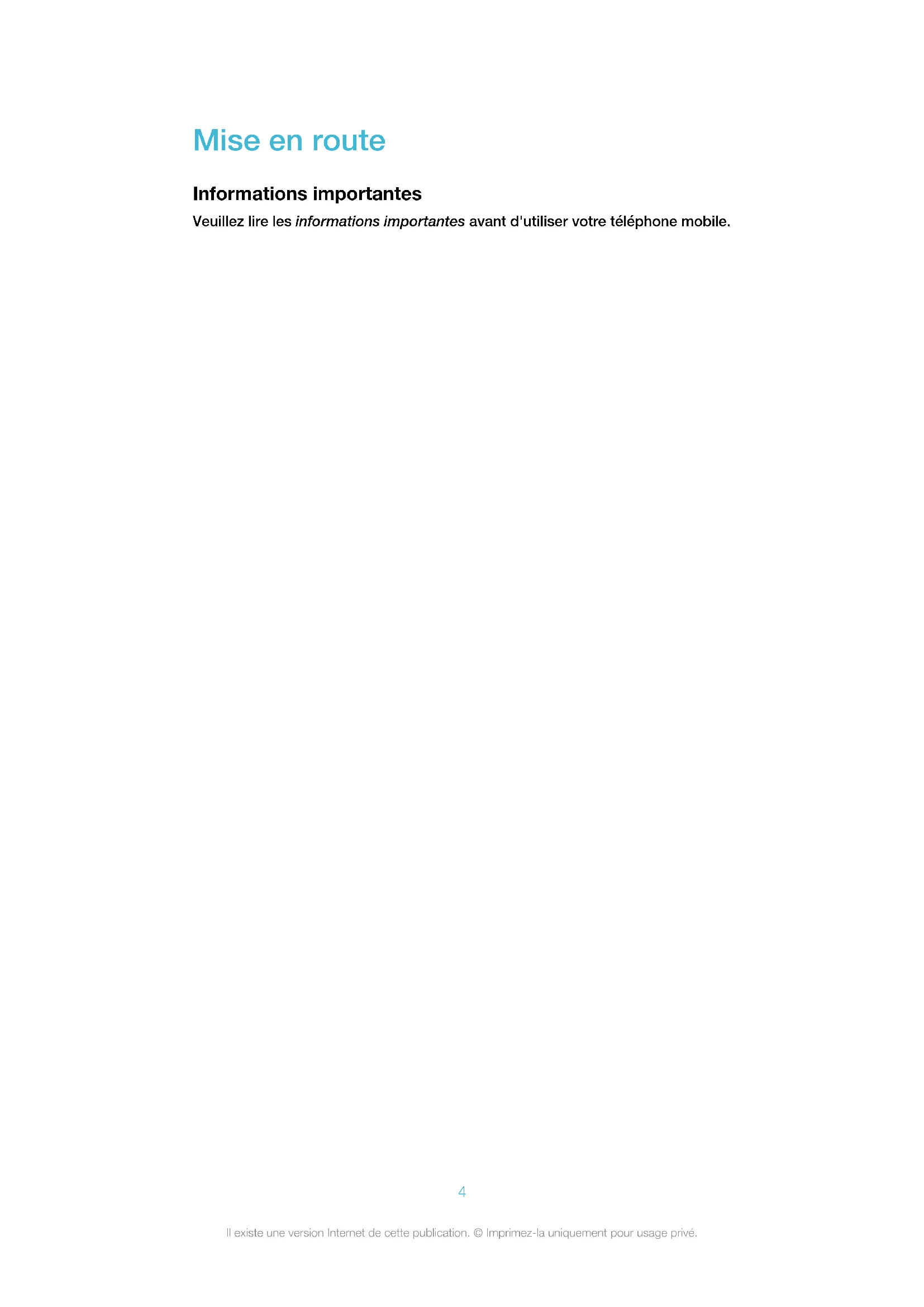Il existe une version Internet de cette publication. © Imprimez-la uniquement pour usage privé.Mise en route Informations importantes Veuillez lire les informations importantes avant d'utiliser votre téléphone mobile.