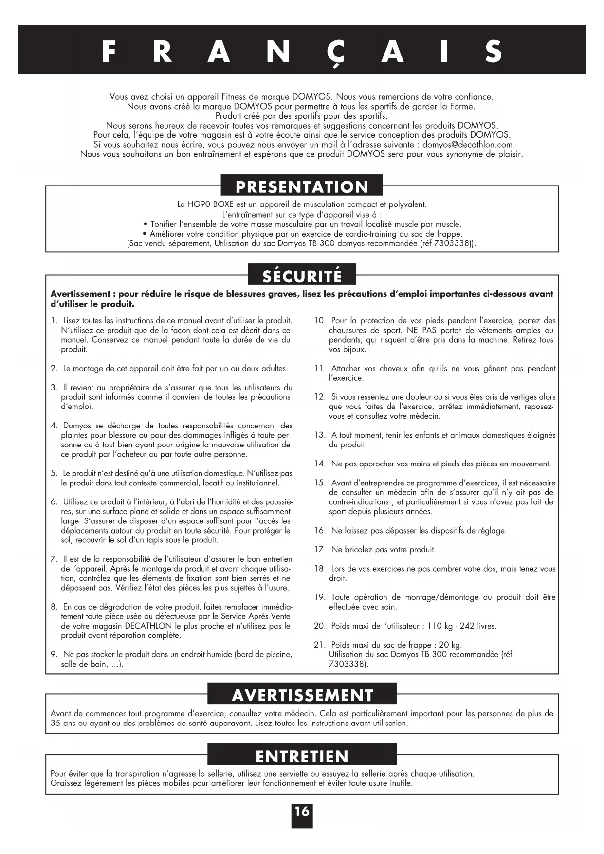 MODE D'EMPLOI HG 90 Boxe DOMYOS
