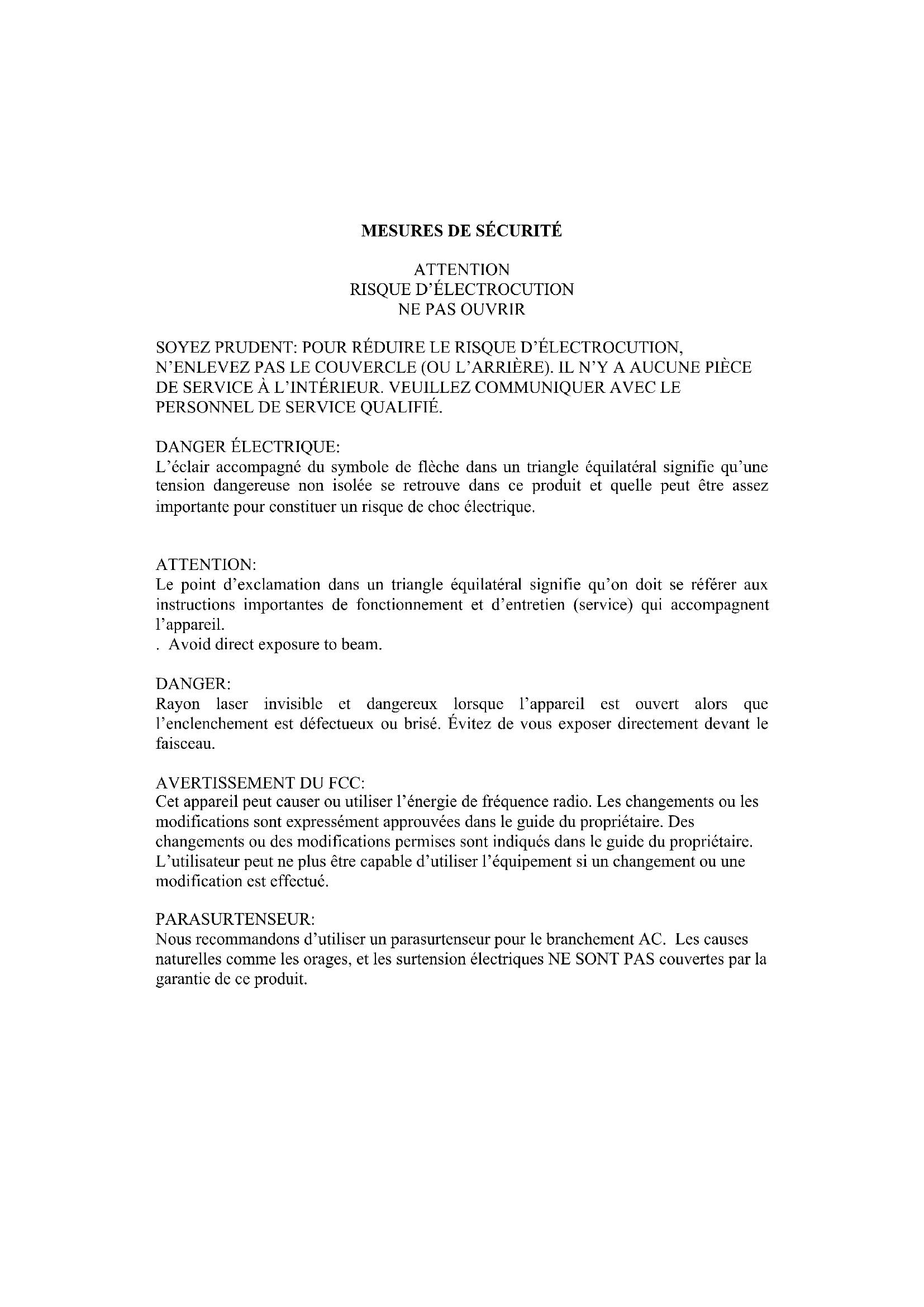 Rayon laser invisible et dangereux lorsque l'appareil est ouvert alors que l'enclenchement est defectieux ou brise. Evitez de vous exposer directement devant le faisceau.