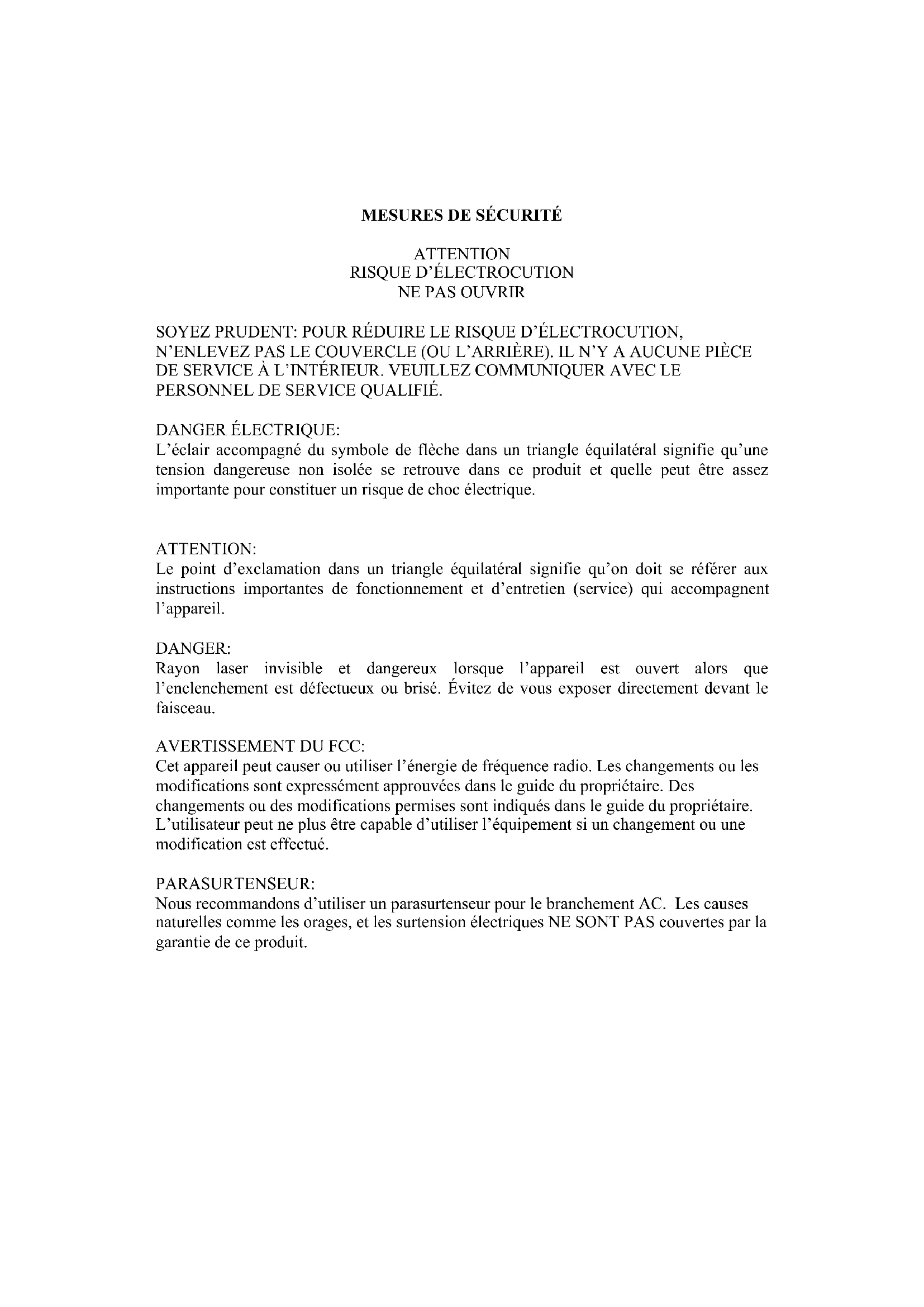 En choisissant un appareil audio de qualité comme celui que vous avez acheté marque le début de votre expérience musicale. Il est maintenant temps de considérer comment profiter au maximum du plaisir et des fonctions de votre appareil. Ce manufacturier et le Groupe d'associations des consommateurs des industries électroniques veut que vous appréciiez votre appareil au maximum en le faisant fonctionner de façon sécuritaire. En obtenant un son puissant et clair sans cacophonie ou distorsion et, encore plus important, sans affecter la sensibilité de votre ouïe. Nossons peuvent être décevants. AVEC le temple, le degré de confort de vos oreilles s'adapte à des niveaux plus élevés de volume du son. Ce qu'on croit être normal comme volume peut actuellement être trop fort et endommager vos oreilles. Faites attention en sélectionnant un niveau de volume sécuritaire AVANT que vos habitudes au son.
