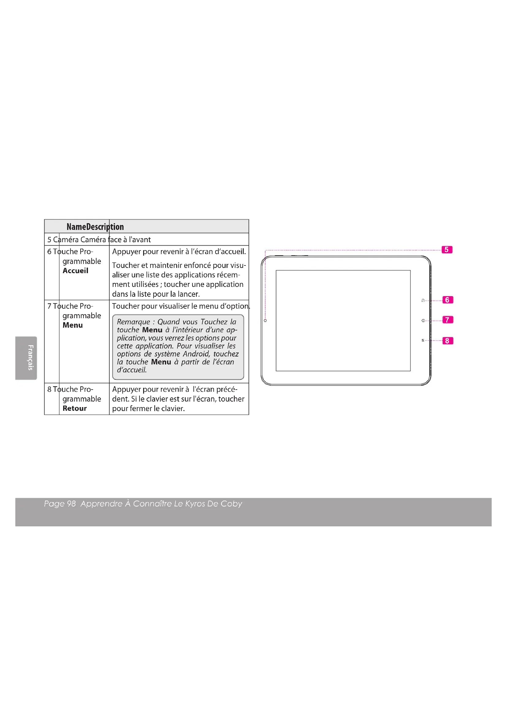 DC 5VRESET HDMI microSDFrançais Page 97 Apprendre À Connaître Le Kyros De Coby Mid8127 Nom Description 1 Touche Volume – Press to decrease the volume level. 2 Touche Volume + Press to increase the volume level. 3 Touche Marche/ Arrêt Press to turn the unit on, or to turn the screen on and o. Press and hold to access the Power O menu. 4 Haut-par- leurs Stereo speakers.Français Page 98 Apprendre À Connaître Le Kyros De Coby Name Description 5 Caméra Caméra face à l'avant 6 Touche Pro- grammable Accueil Appuyer pour revenir à l’écran d’accueil. Toucher et maintenir enfoncé pour visu- aliser une liste des applications récem- ment utilisées ; toucher une application dans la liste pour la lancer. 7 Touche Pro- grammable Menu Toucher pour visualiser le menu d’option. Remarque : Quand vous Touchez la touche M enu à l’intérieur d’une ap- plication, vous verrez les options pour cette application. Pour visualiser les options de système Android, touchez la touche Menu à partir de l’écran d’accueil. 8 Touche Pro- grammable Retour Appuyer pour revenir à l'écran précé- dent. Si le clavier est sur l'écran, toucher pour fermer le clavier.
