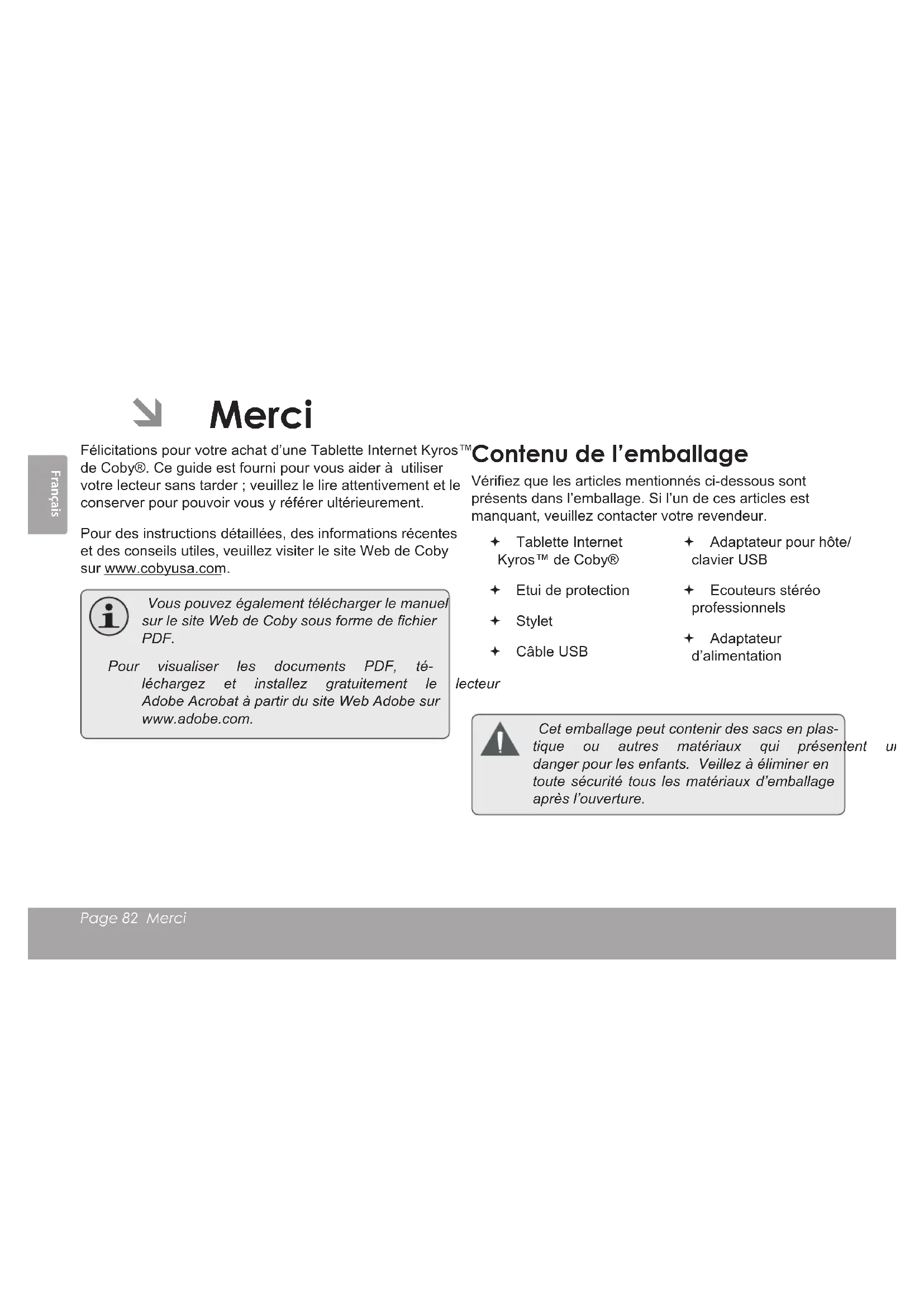 Page 82 Merci Français  Merci Félicitations pour votre achat d’une Tablette Internet Kyros™ de Coby®. Ce guide est fourni pour vous aider à utiliser votre lecteur sans tarder ; veuillez le lire attentivement et le conserver pour pouvoir vous y référer ultérieurement. Pour des instructions détaillées, des informations récentes et des conseils utiles, veuillez visiter le site Web de Coby sur www.cobyusa.com. Vouspouvezégalementtéléchargerlemanuel surlesiteWebdeCobysousformedechier PDF. Pour visualiser les documents PDF, té- léchargez et installez gratuitement le lecteur AdobeAcrobatàpartirdusiteWebAdobesur www.adobe.com. Contenu de l’emballage Vériez que les articles mentionnés ci-dessous sont présents dans l’emballage. Si l’un de ces articles est manquant, veuillez contacter votre revendeur. Tablette Internet Kyros™ de Coby® Etui de protection Stylet Câble USB Adaptateur pour hôte/ clavier USB Ecouteurs stéréo professionnels Adaptateur d’alimentation Cetemballagepeutcontenirdessacsenplas- tique ou autres matériaux qui présentent un dangerpourlesenfants.Veillezàélimineren toute sécurité tous les matériaux d’emballage aprèsl’ouverture.Page 83 Merci Français Caractéristiques Naviguez le Web Visitez vos sites web favoris Vériez vos e-mails Gardez contact avec vos amis et votre famille Regardez des vidéos YouTube™ Parcourez la communauté de partage de vidéos la plus populaire du monde Lisez vos livres favoris Téléchargez des milliers de livres avec le comprenait lecteur E-book* Découvrez de milliers d’applications pour Android™ Jeux, applications, et plus encore avec le marché installé Branchez-vous à l’Internet sans l Réseautage Haut Débit Wi-Fi 802.11 b/g/n Protez de votre bibliothèque multimédia n’importe où Une centrale portable lit des formats musique, vidéo et photo populaires Lecteur de carte mémoire microSD Augmentez votre capacité de stockage (jusqu’à 32 Go pris en charge) Détection de l’orientation automatique Lisez comme vous le souhaitez ; l’écran s’ajuste automatiquement !