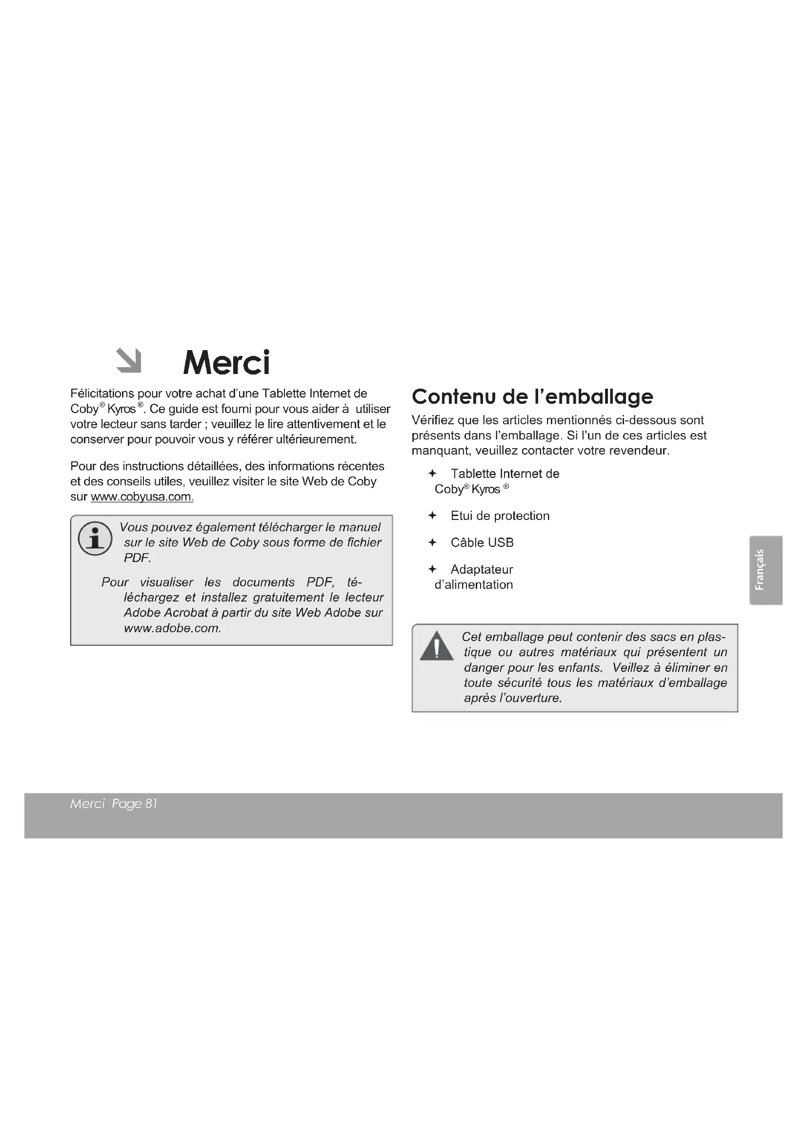 Table des MatièresFrançais Merci Page 81  Merci Félicitations pour votre achat d’une Tablette Internet de Coby