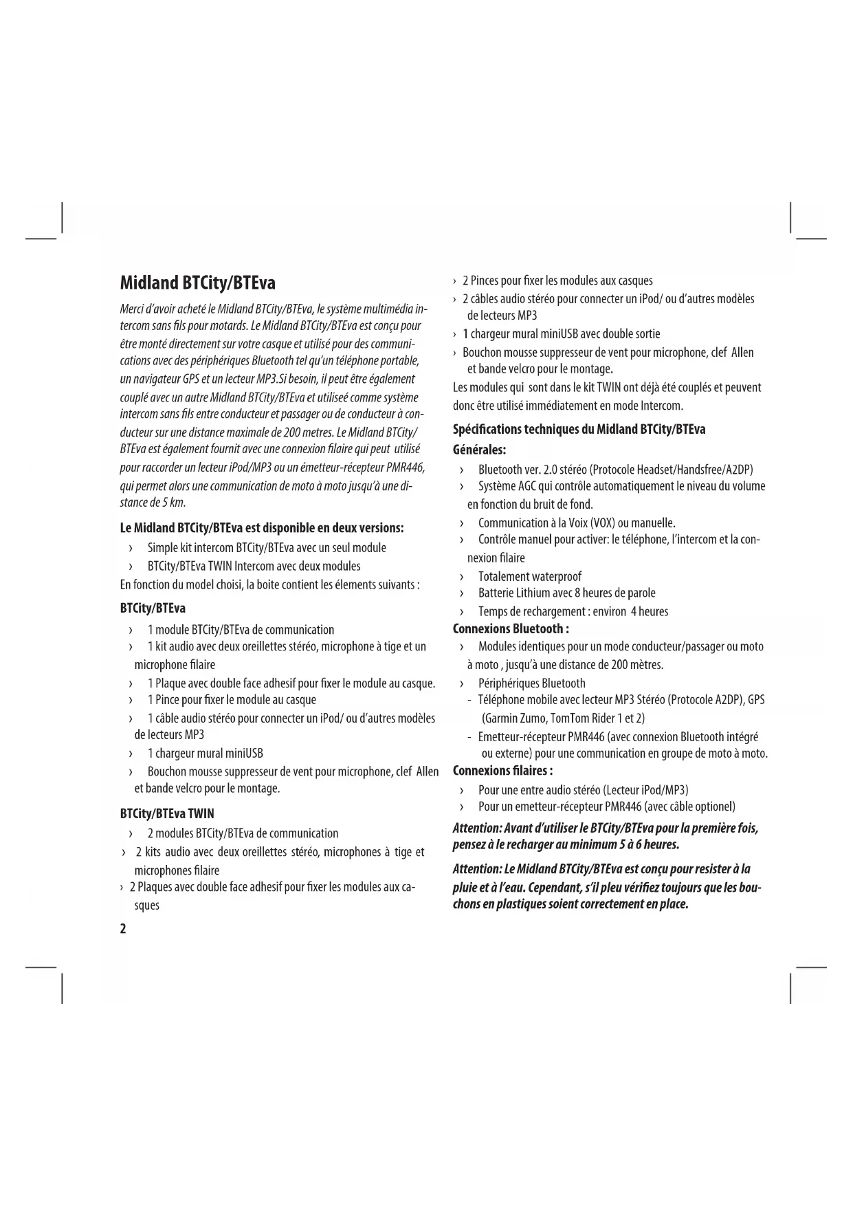 - Fonction Midland BTCity/BTEva Merci d’avoir acheté le Midland BTCity/BTEva, le système multimédia in- tercom sans ls pour motards. Le Midland BTCity/BTEva est conçu pour être monté directement sur votre casque et utilisé pour des communi- cations avec des périphériques Bluetooth tel qu’un téléphone portable, un navigateur GPS et un lecteur MP3.Si besoin, il peut être également couplé avec un autre Midland BTCity/BTEva et utiliseé comme système intercom sans ls entre conducteur et passager ou de conducteur à con- ducteur sur une distance maximale de 200 metres. Le Midland BTCity/ BTEva est également fournit avec une connexion laire qui peut utilisé pour raccorder un lecteur iPod/MP3 ou un émetteur-récepteur PMR446, qui permet alors une communication de moto à moto jusqu’à une di- stance de 5 km. Le Midland BTCity/BTEva est disponible en deux versions: › Simple kit intercom BTCity/BTEva avec un seul module › BTCity/BTEva TWIN Intercom avec deux modules En fonction du model choisi, la boite contient les élements suivants : BTCity/BTEva › 1 module BTCity/BTEva de communication › 1 kit audio avec deux oreillettes stéréo, microphone à tige et un microphone laire › 1 Plaque avec double face adhesif pour xer le module au casque. › 1 Pince pour xer le module au casque › 1 câble audio stéréo pour connecter un iPod/ ou d’autres modèles de lecteurs MP3 › 1 chargeur mural miniUSB › Bouchon mousse suppresseur de vent pour microphone, clef Allen et bande velcro pour le montage. BTCity/BTEva TWIN › 2 modules BTCity/BTEva de communication › 2 kits audio avec deux oreillettes stéréo, microphones à tige et microphones laire › 2 Plaques avec double face adhesif pour xer les modules aux ca- sques › 2 Pinces pour xer les modules aux casques › 2 câbles audio stéréo pour connecter un iPod/ ou d’autres modèles de lecteurs MP3 › 1 chargeur mural miniUSB avec double sortie › Bouchon mousse suppresseur de vent pour microphone, clef Allen et bande velcro pour le montage. Les modules qui sont dans le kit TWIN ont déjà été couplés et peuvent donc être utilisé immédiatement en mode Intercom. Spécications techniques du Midland BTCity/BTEva Générales: › Bluetooth ver. 2.0 stéréo (Protocole Headset/Handsfree/A2DP) › Système AGC qui contrôle automatiquement le niveau du volume en fonction du bruit de fond. › Communication à la Voix (VOX) ou manuelle. › Contrôle manuel pour activer: le téléphone, l’intercom et la con- nexion laire › Totalement waterproof › Batterie Lithium avec 8 heures de parole › Temps de rechargement : environ 4 heures Connexions Bluetooth : › Modules identiques pour un mode conducteur/passager ou moto à moto , jusqu’à une distance de 200 mètres. › Périphériques Bluetooth - Téléphone mobile avec lecteur MP3 Stéréo (Protocole A2DP), GPS (Garmin Zumo, TomTom Rider 1 et 2) - Emetteur-récepteur PMR446 (avec connexion Bluetooth intégré ou externe) pour une communication en groupe de moto à moto. Connexions laires : › Pour une entre audio stéréo (Lecteur iPod/MP3) › Pour un emetteur-récepteur PMR446 (avec câble optionel) Attention: Avant d’utiliser le BTCity/BTEva pour la première fois, pensez à le recharger au minimum 5 à 6 heures. Attention: Le Midland BTCity/BTEva est conçu pour resister à la pluie et à l’eau. Cependant, s’il pleu vériez toujours que les bou- chons en plastiques soient correctement en place.F p. 152