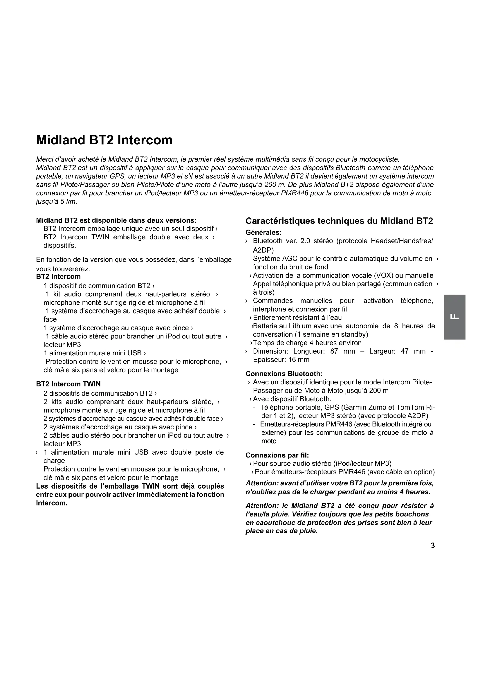Midland BT2 est disponible dans deux versions: BT2 Intercom emballage unique avec un seul dispositif › BT2 Intercom TWIN emballage double avec deux › dispositifs. En fonction de la version que vous possédez, dans l’emballage vous trouvererez: BT2 Intercom 1 dispositif de communication BT2 › 1 kit audio comprenant deux haut-parleurs stéréo, › microphone monté sur tige rigide et microphone à l 1 système d’accrochage au casque avec adhésif double › face 1 système d’accrochage au casque avec pince › 1 câble audio stéréo pour brancher un iPod ou tout autre › lecteur MP3 1 alimentation murale mini USB › Protection contre le vent en mousse pour le microphone, › clé mâle six pans et velcro pour le montage BT2 Intercom TWIN 2 dispositifs de communication BT2 › 2 kits audio comprenant deux haut-parleurs stéréo, › microphone monté sur tige rigide et microphone à l 2 systèmes d’accrochage au casque avec adhésif double face › 2 systèmes d’accrochage au casque avec pince › 2 câbles audio stéréo pour brancher un iPod ou tout autre › lecteur MP3 1 alimentation murale mini USB avec double poste de › charge Protection contre le vent en mousse pour le microphone, › clé mâle six pans et velcro pour le montage Les dispositifs de l’emballage TWIN sont déjà couplés entre eux pour pouvoir activer immédiatement la fonction Intercom. Caractéristiques techniques du Midland BT2 Générales: Bluetooth ver. 2.0 stéréo (protocole Headset/Handsfree/ › A2DP) Système AGC pour le contrôle automatique du volume en › fonction du bruit de fond Activation de la communication vocale (VOX) ou manuelle › Appel téléphonique privé ou bien partagé (communication › à trois) Commandes manuelles pour: activation téléphone, › interphone et connexion par l Entièrement résistant à l’eau › Batterie au Lithium avec une autonomie de 8 heures de › conversation (1 semaine en standby) Temps de charge 4 heures environ › Dimension: Longueur: 87 mm – Largeur: 47 mm - › Epaisseur: 16 mm Connexions Bluetooth: Avec un dispositif identique pour le mode Intercom Pilote- › Passager ou de Moto à Moto jusqu’à 200 m Avec dispositif Bluetooth: › - Téléphone portable, GPS (Garmin Zumo et TomTom Ri- der 1 et 2), lecteur MP3 stéréo (avec protocole A2DP) - Emetteurs-récepteurs PMR446 (avec Bluetooth intégré ou externe) pour les communications de groupe de moto à moto Connexions par l: Pour source audio stéréo (iPod/lecteur MP3) › Pour émetteurs-récepteurs PMR446 (avec câble en option) › Attention: avant d’utiliser votre BT2 pour la première fois, n’oubliez pas de le charger pendant au moins 4 heures. Attention: le Midland BT2 a été conçu pour résister à l’eau/la pluie. Vériez toujours que les petits bouchons en caoutchouc de protection des prises sont bien à leur place en cas de pluie. Midland BT2 Intercom Merci d’avoir acheté le Midland BT2 Intercom, le premier réel système multimédia sans l conçu pour le motocycliste. Midland BT2 est un dispositif à appliquer sur le casque pour communiquer avec des dispositifs Bluetooth comme un téléphone portable, un navigateur GPS, un lecteur MP3 et s’il est associé à un autre Midland BT2 il devient également un système intercom sans l Pilote/Passager ou bien Pilote/Pilote d’une moto à l’autre jusqu’à 200 m. De plus Midland BT2 dispose également d’une connexion par l pour brancher un iPod/lecteur MP3 ou un émetteur-récepteur PMR446 pour la communication de moto à moto jusqu’à 5 km.4 Structure du mode d’emploi Le manuel se divise en 5 sections principales: Description du dispositif et système de xation › Couplage (Pairing) avec les dispositifs Bluetooth › Utilisation des dispositifs Bluetooth › Utilisation de l’entrée audio par l › Congurations spéciales › Pour une conguration plus simple de votre BT2 nous nous conseillons de suivre la même séquence que la structure du manuel: Première étape: › xer le dispositif au casque en suivant les instructions de la section «Description du systeme de xation au casque» Deuxième étape: › coupler les dispositifs Bluetooth (comme par exemple téléphone portable ou GPS) au BT2. Suivre la procédure spécique dans le chapitre «Couplage aux dispositifs bluetooth (couplage)», relative aux dispositifs Bluetooth que vous possédez. Troisième étape: › une fois terminée la phase de couplage (pairing) vous pouvez passer au chapitre «Utilisation des fonctions des dispositifs bluetooth» pour vérier les fonctions spéciques liées aux dispositifs couplés auparavant. Quatrième étape: › si vous avez également des dispositifs à l, vous pouvez consulter le chapitre «Utilisation de l’entree audio a l» Cinquième étape: › s’il s’avère nécessaire d’utiliser des fonctions avancées, vous pouvez consulter le chapitre «Congurations speciales» Chargement des batteries S’assurer que l’unité est complètement rechargées avant de l’utiliser pour la première fois. Recharger pendant au moins 5-6 heures avant la toute première utilisation. Habituellement 4 hours sufsent pour une recharge complète. Recharger l’unité en branchant le chargeur secteur dans la prise de recharge (soulever le couvercle en plastique pour brancher la che). Le voyant rouge sur l’unité clignotera quand le chargement › commencera. Laisser l’appareil se recharger jusqu’à ce que le voyant › rouge s’éteigne. Quand le chargement est terminé, enlever l’appareil du › chargeur. Description du dispositif et du système de xation Description BT2 Le dispositif BT2 est équipé, sur la partie frontale, de 5 boutons multi-fonctions et dans la partie inférieure de trois connexions à l. Description de la fonction des boutons: Téléphone: Permet d’activer/de désactiver et de contrôler › les différentes fonctions du téléphone portable Intercom: Permet l’activation/la désa