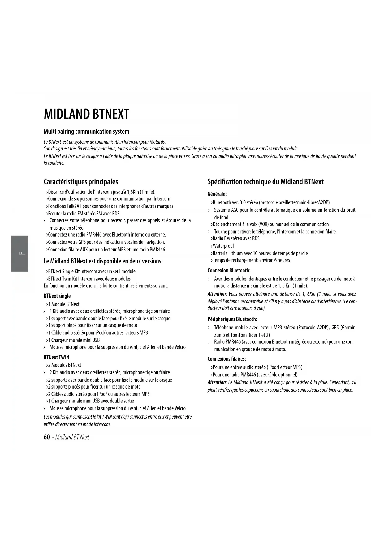 MIDLAND BTNEXT Multi pairing communication system Le BTNext est un système de communication Intercom pour Motards. Son design est très n et aérodynamique, toutes les fonctions sont facilement utilisable grâce au trois grande touché place sur l’avant du module. Le BTNext est xé sur le casque à l’aide de la plaque adhésive ou de la pince vissée. Grace à son kit audio ultra plat vous pouvez écouter de la musique de haute qualité pendant la conduite. Caractéristiques principales › Distance d’utilisation de l’Intercom jusqu’à 1,6Km (1 mile). › Connexion de six personnes pour une communication par Intercom › Fonctions Talk2All pour connecter des interphones d’autres marques › Écouter la radio FM stéréo FM avec RDS › Connectez votre téléphone pour recevoir, passer des appels et écouter de la musique en stéréo. › Connectez une radio PMR446 avec Bluetooth interne ou externe. › Connectez votre GPS pour des indications vocales de navigation. › Connexion laire AUX pour un lecteur MP3 et une radio PMR446. Le Midland BTNext est disponible en deux versions: › BTNext Single Kit Intercom avec un seul module › BTNext Twin Kit Intercom avec deux modules En fonction du modèle choisi, la bôite contient les éléments suivant:BTNext single › 1 Module BTNext › 1 Kit audio avec deux oreillettes stéréo, microphone tige ou laire › 1 support avec bande double face pour xé le module sur le casque › 1 support pincé pour xer sur un casque de moto › 1 Câble audio stéréo pour iPod/ ou autres lecteurs MP3 › 1 Chargeur murale mini USB › Mousse microphone pour la suppression du vent, clef Allen et bande Velcro BTNext TWIN › 2 Modules BTNext › 2 Kit audio avec deux oreillettes stéréo, microphone tige ou laire › 2 supports avec bande double face pour xé le module sur le casque › 2 supports pincés pour xer sur un casque de moto › 2 Câbles audio stéréo pour iPod/ ou autres lecteurs MP3 › 1 Chargeur murale mini USB avec double sortie › Mousse microphone pour la suppression du vent, clef Allen et bande Velcro Les modules qui composent le kit TWIN sont déjà connectés entre eux et peuvent être utilisé directement en mode Intercom. Spécification technique du Midland BTNext Générale: › Bluetooth ver. 3.0 stéréo (protocole oreillette/main-libre/A2DP) › Système AGC pour le contrôle automatique du volume en fonction du bruit de fond. › Déclenchement à la voix (VOX) ou manuel de la communication › Touche pour activer: le téléphone, l’Intercom et la connexion laire › Radio FM stéréo avec RDS › Waterproof › Batterie Lithium avec 10 heures de temps de parole › Temps de rechargement: environ 6 heuresConnexion Bluetooth: › Avec des modules identiques entre le conducteur et le passager ou de moto à moto, la distance maximale est de 1, 6 Km (1 mile). Attention: Vous pouvez atteindre une distance de 1, 6Km (1 mile) si vous avez déployé l’antenne escamotable et s’il n’y a pas d’obstacle ou d’interférence (Le con-ducteur doit être toujours à vue).Périphériques Bluetooth: › Téléphone mobile avec lecteur MP3 stéréo (Protocole A2DP), GPS (Garmin Zumo et TomTom Rider 1 et 2) › Radio PMR446 (avec connexion Bluetooth intégrée ou externe) pour une com- munication en groupe de moto à moto. Connexions filaires: › Pour une entrée audio stéréo (iPod/Lecteur MP3) › Pour une radio PMR446 (avec câble optionnel)Attention: Le Midland BTNext a été conçu pour résister à la pluie. Cependant, s’il pleut vériez que les capuchons en caoutchouc des connecteurs sont bien en place.F Midland BT Next - 61 Rechargement des batteries Attention: Assurez-vous le module soit totalement chargé avant son utilisation. Avant sa première utilisation pour un rechargement totale il faut laissez le module au moins 8 heures en charge. Charger le module en connectant le chargeur mural dans la prise de recharge- ment (soulevez le capuchon pour insérer la prise). La LED rouge sur le module clignote pendant le chargement. Laissez en charge jusqu’à ce que le module cesse de clignoter ou que la LED passé au bleu. Quand la charge est complète (La LED rouge ne clignote plus), retirez le module du chargeur. Normalement, après la première utilisation, il faut 6 heures pour un recharge- ment complet. Attention: à chaque fois que le chargeur mini USB est connecté (ou déconnecté), le module est automatiquement éteint. Pour pouvoir l’utiliser pendant le chargement, il faut allumer le module avec le chargeur déjà connecté. Description du module et fixation Description du BT Next Le BTNext possède 5 touches sur l’avant. Les trois principaux sont : Avancé (sur la gauche), la touché centrale et Reculer (sur la droite). Les deux petites touches sont: Volume + et Volume -. Description des connexions filaires › Jack de charge: Permet de recharger le module à l’aide d’un chargeur standard mini USB. › Jack kit audio: Permet de connecter le kit audio (Oreillette stéréo et micro- phone) › Jack Auxiliaire Audio (AUX) 2.5mm : Peut être utilisé pour connecter une source audio tel qu’un iPod/lecteur MP3, ou une radio PMR446 En plus le BTNext a une antenne escamotable sur le dessus pour un maximum de distance. Pour soulever l’antenne, appuyez doucement à l’arrière et l’antenne se relève automatiquement. Pour la rabattre, bascule l’antenne en arrière et appuyez en position fermée. Centrale Volume -Volume + Avant Arrière Jack de charge Jack kit audio Jack Auxiliaire Audio (AUX)62 - Midland BT Next