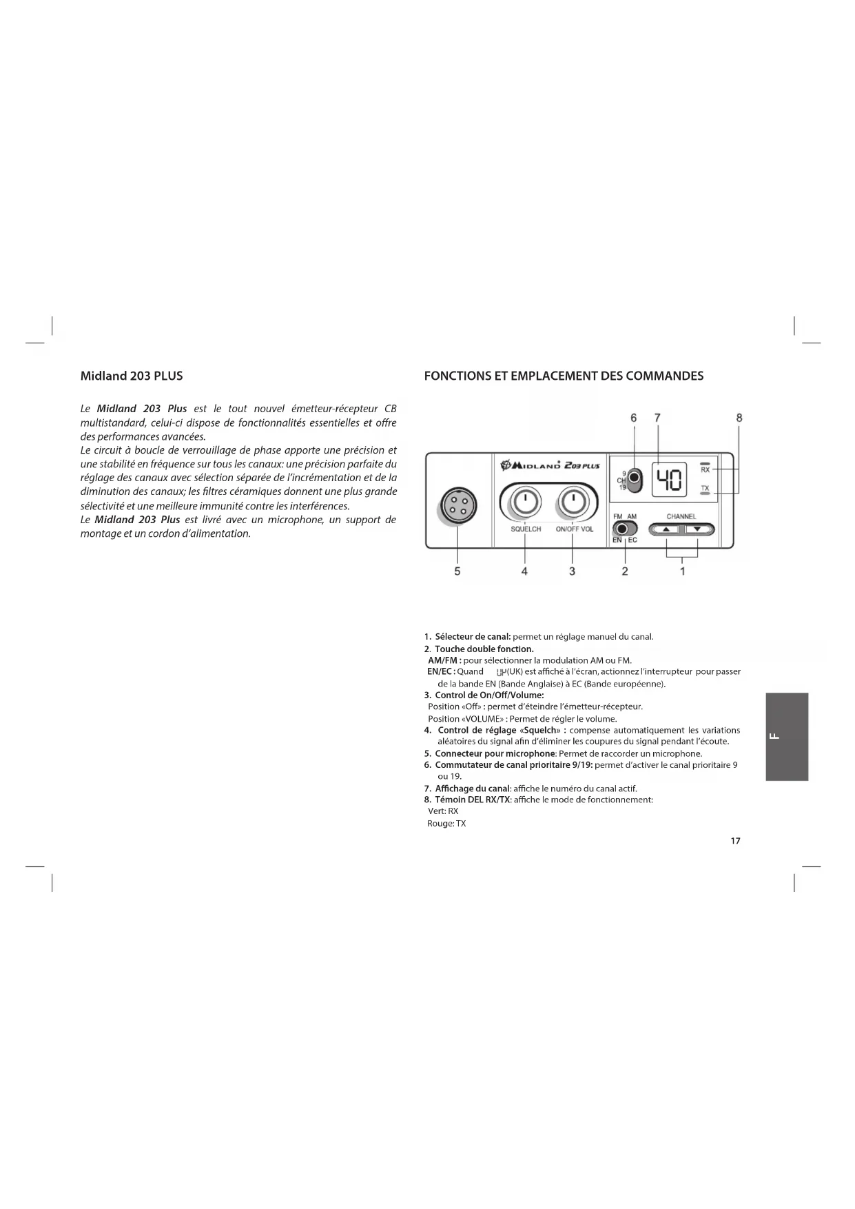 Midland 203 PLUS Le Midland 203 Plus est le tout nouvel émetteur-récepteur CB multistandard, celui-ci dispose de fonctionnalités essentielles et ore des performances avancées. Le circuit à boucle de verrouillage de phase apporte une précision et une stabilité en fréquence sur tous les canaux: une précision parfaite du réglage des canaux avec sélection séparée de l’incrémentation et de la diminution des canaux; les ltres céramiques donnent une plus grande sélectivité et une meilleure immunité contre les interférences. Le Midland 203 Plus est livré avec un microphone, un support de montage et un cordon d’alimentation.