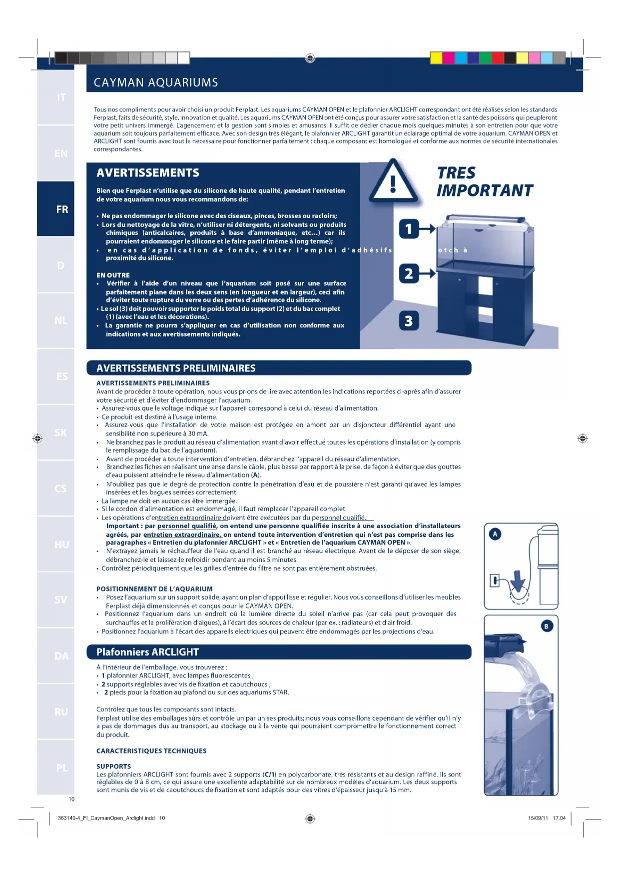 Tous nos compliments pour avoir choisi un produit Ferplast. Les aquariums CAYMAN OPEN et le plafonnier ARCLIGHT correspondant ont été réalisés selon les standards Ferplast, faits de sécurité, style, innovation et qualité. Les aquariums CAYMAN OPEN ont été conçus pour assurer votre satisfaction et la santé des poissons qui peupleront votre petit univers immergé. L'agencement et la gestion sont simples et amusants. Il suffit de dédier chaque mois quelques minutes à son entretien pour que votre aquarium soit toujours parfaitement efficace. Avec son design très élégant, le plafonnier ARCLIGHT garantit un éclairage optimal de votre aquarium. CAYMAN OPEN et ARCLIGHT sont fournis avec tout le nécessaire pour fonctionner parfaitement ; chaque composant est homologué et conforme aux normes de sécurité internationales correspondantes.