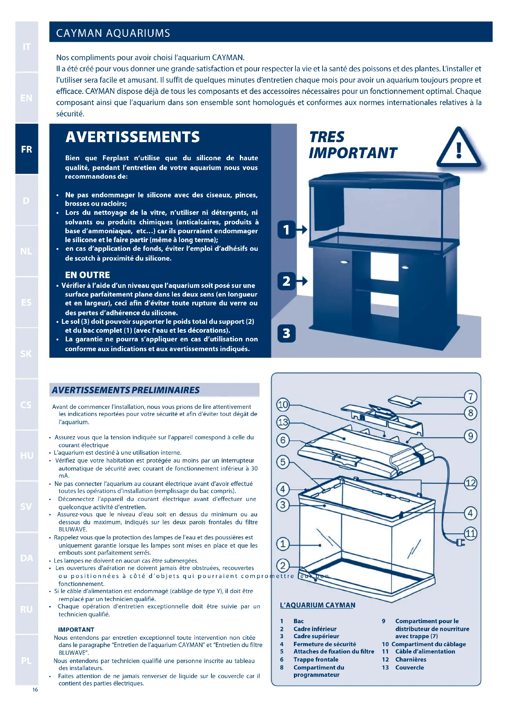 - Ne pas connecter l’aquarium au courant électrique avant d’avoir effectué toutes les opérations d’installation (remplissage du bac compris).• Déconnectez l’appareil du courant électrique avant d’effectuer une quelconque activité d’entretien.• Assurez-vous que le niveau d’eau soit en dessus du minimum ou au dessous du maximum, indiqués sur les deux parois frontales du filtre BLUWAVE.• Rappelez vous que la protection des lampes de l’eau et des poussières est uniquement garantie lorsque les lampes sont mises en place et que les embouts sont parfaitement serrés.• Les lampes ne doivent en aucun cas être submergées.• Les ouvertures d’aération ne doivent jamais être obstruées, recouvertes ou positionnées à côté d’objets qui pourraient compromettre leur bon fonctionnement.• Si le câble d’alimentation est endommagé (cablâge de type Y), il doit être remplacé par un technicien qualifié.• Chaque opération d’entretien exceptionnelle doit être suivie par un technicien qualifié. IMPORTANT Nous entendons par entretien exceptionnel toute intervention non citée dans le paragraphe “Entretien de l’aquarium CAYMAN” et “Entretien du filtre BLUWAVE”. Nous entendons par technicien qualifié une personne inscrite au tableau des installateurs.• Faites attention de ne jamais renverser de liquide sur le couvercle car il contient des parties électriques.Nos compliments pour avoir choisi l’aquarium CAYMAN. Il a été créé pour vous donner une grande satisfaction et pour respecter la vie et la santé des poissons et des plantes. L’installer et l’utiliser sera facile et amusant. Il suffit de quelques minutes d’entretien chaque mois pour avoir un aquarium toujours propre et efficace. CAYMAN dispose déjà de tous les composants et des accessoires nécessaires pour un fonctionnement optimal. Chaque composant ainsi que l’aquarium dans son ensemble sont homologués et conformes aux normes internationales relatives à la sécurité.L’AQUARIUM CAYMAN1 Bac2 Cadre inférieur3 Cadre supérieur4 Fermeture de sécurité 5 Attaches de xation du ltre 6 Trappe frontale8 Compartiment du programmateur9 Compartiment pour le distributeur de nourriture avec trappe (7)10 Compartiment du câblage11 Câble d’alimentation12 Charnières13 Couvercle