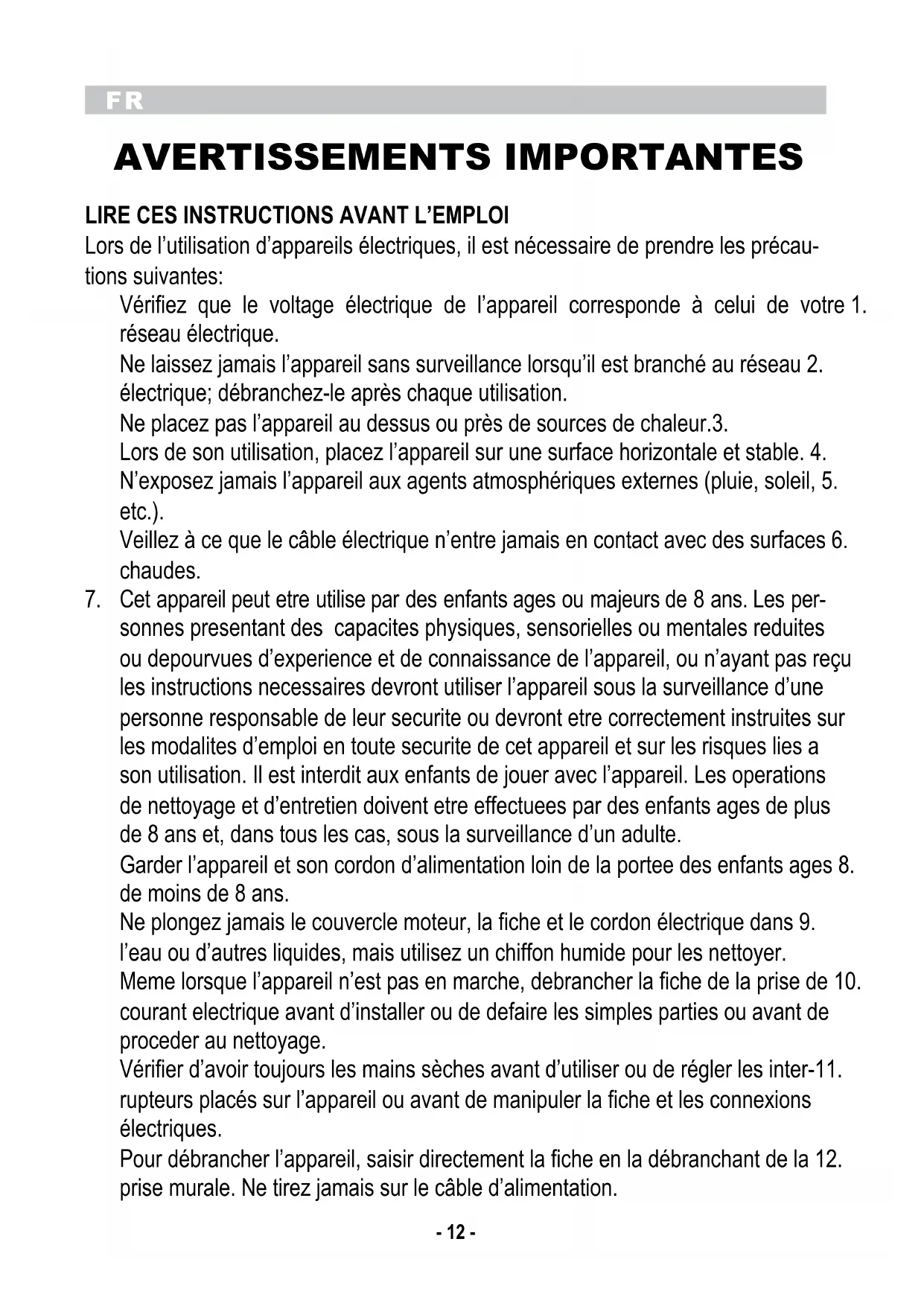 Lors de l’utilisation d’appareils électriques, il est nécessaire de prendre les précau- tions suivantes: Vérifiez que le voltage électrique de l’appareil corresponde à celui de votre 1. réseau électrique. Ne laissez jamais l’appareil sans surveillance lorsqu’il est branché au réseau 2. électrique; débranchez-le après chaque utilisation. Ne placez pas l’appareil au dessus ou près de sources de chaleur.3. Lors de son utilisation, placez l’appareil sur une surface horizontale et stable. 4. N’exposez jamais l’appareil aux agents atmosphériques externes (pluie, soleil, 5. etc.). Veillez à ce que le câble électrique n’entre jamais en contact avec des surfaces 6. chaudes. Cet appareil peut etre utilise par des enfants ages ou majeurs de 8 ans. Les per-7. sonnes presentant des capacites physiques, sensorielles ou mentales reduites ou depourvues d’experience et de connaissance de l’appareil, ou n’ayant pas reçu les instructions necessaires devront utiliser l’appareil sous la surveillance d’une personne responsable de leur securite ou devront etre correctement instruites sur les modalites d’emploi en toute securite de cet appareil et sur les risques lies a son utilisation. Il est interdit aux enfants de jouer avec l’appareil. Les operations de nettoyage et d’entretien doivent etre effectuees par des enfants ages de plus de 8 ans et, dans tous les cas, sous la surveillance d’un adulte. Garder l’appareil et son cordon d’alimentation loin de la portee des enfants ages 8. de moins de 8 ans. Ne plongez jamais le couvercle moteur, la fiche et le cordon électrique dans 9. l’eau ou d’autres liquides, mais utilisez un chiffon humide pour les nettoyer. Meme lorsque l’appareil n’est pas en marche, debrancher la fiche de la prise de 10. courant electrique avant d’installer ou de defaire les simples parties ou avant de proceder au nettoyage. Vérifier d’avoir toujours les mains sèches avant d’utiliser ou de régler les inter-11. rupteurs placés sur l’appareil ou avant de manipuler la fiche et les connexions électriques. Pour débrancher l’appareil, saisir directement la fiche en la débranchant de la 12. prise murale. Ne tirez jamais sur le câble d’alimentation.FR