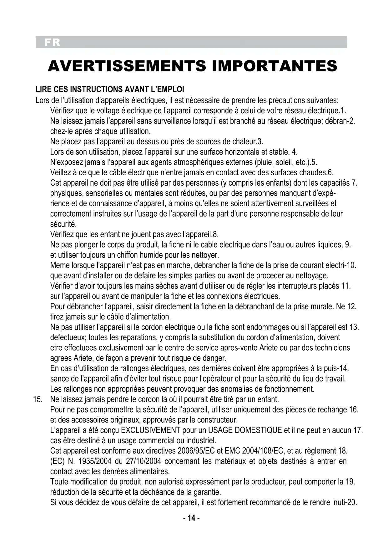 Lors de l’utilisation d’appareils électriques, il est nécessaire de prendre les précautions suivantes: Vérifiez que le voltage électrique de l’appareil corresponde à celui de votre réseau électrique.1. Ne laissez jamais l’appareil sans surveillance lorsqu’il est branché au réseau électrique; débran-2. chez-le après chaque utilisation. Ne placez pas l’appareil au dessus ou près de sources de chaleur.3. Lors de son utilisation, placez l’appareil sur une surface horizontale et stable. 4. N’exposez jamais l’appareil aux agents atmosphériques externes (pluie, soleil, etc.).5. Veillez à ce que le câble électrique n’entre jamais en contact avec des surfaces chaudes.6. Cet appareil ne doit pas être utilisé par des personnes (y compris les enfants) dont les capacités 7. physiques, sensorielles ou mentales sont réduites, ou par des personnes manquant d’expé- rience et de connaissance d’appareil, à moins qu’elles ne soient attentivement surveillées et correctement instruites sur l’usage de l’appareil de la part d’une personne responsable de leur sécurité. Vérifiez que les enfant ne jouent pas avec l’appareil.8. Ne pas plonger le corps du produit, la fiche ni le cable electrique dans l’eau ou autres liquides, 9. et utiliser toujours un chiffon humide pour les nettoyer. Meme lorsque l’appareil n’est pas en marche, debrancher la fiche de la prise de courant electri-10. que avant d’installer ou de defaire les simples parties ou avant de proceder au nettoyage. Vérifier d’avoir toujours les mains sèches avant d’utiliser ou de régler les interrupteurs placés 11. sur l’appareil ou avant de manipuler la fiche et les connexions électriques. Pour débrancher l’appareil, saisir directement la fiche en la débranchant de la prise murale. Ne 12. tirez jamais sur le câble d’alimentation. Ne pas utiliser l’appareil si le cordon electrique ou la fiche sont endommages ou si l’appareil est 13. defectueux; toutes les reparations, y compris la substitution du cordon d’alimentation, doivent etre effectuees exclusivement par le centre de service apres-vente Ariete ou par des techniciens agrees Ariete, de façon a prevenir tout risque de danger. En cas d’utilisation de rallonges électriques, ces dernières doivent être appropriées à la puis-14. sance de l’appareil afin d’éviter tout risque pour l’opérateur et pour la sécurité du lieu de travail. Les rallonges non appropriées peuvent provoquer des anomalies de fonctionnement. Ne laissez jamais pendre le cordon là où il pourrait être tiré par un enfant.15. Pour ne pas compromettre la sécurité de l’appareil, utiliser uniquement des pièces de rechange 16. et des accessoires originaux, approuvés par le constructeur. L’appareil a été conçu EXCLUSIVEMENT pour un USAGE DOMESTIQUE et il ne peut en aucun 17. cas être destiné à un usage commercial ou industriel. Cet appareil est conforme aux directives 2006/95/EC et EMC 2004/108/EC, et au règlement 18. (EC) N. 1935/2004 du 27/10/2004 concernant les matériaux et objets destinés à entrer en contact avec les denrées alimentaires. Toute modification du produit, non autorisé expressément par le producteur, peut comporter la 19. réduction de la sécurité et la déchéance de la garantie. Si vous décidez de vous défaire de cet appareil, il est fortement recommandé de le rendre inuti-20.FR