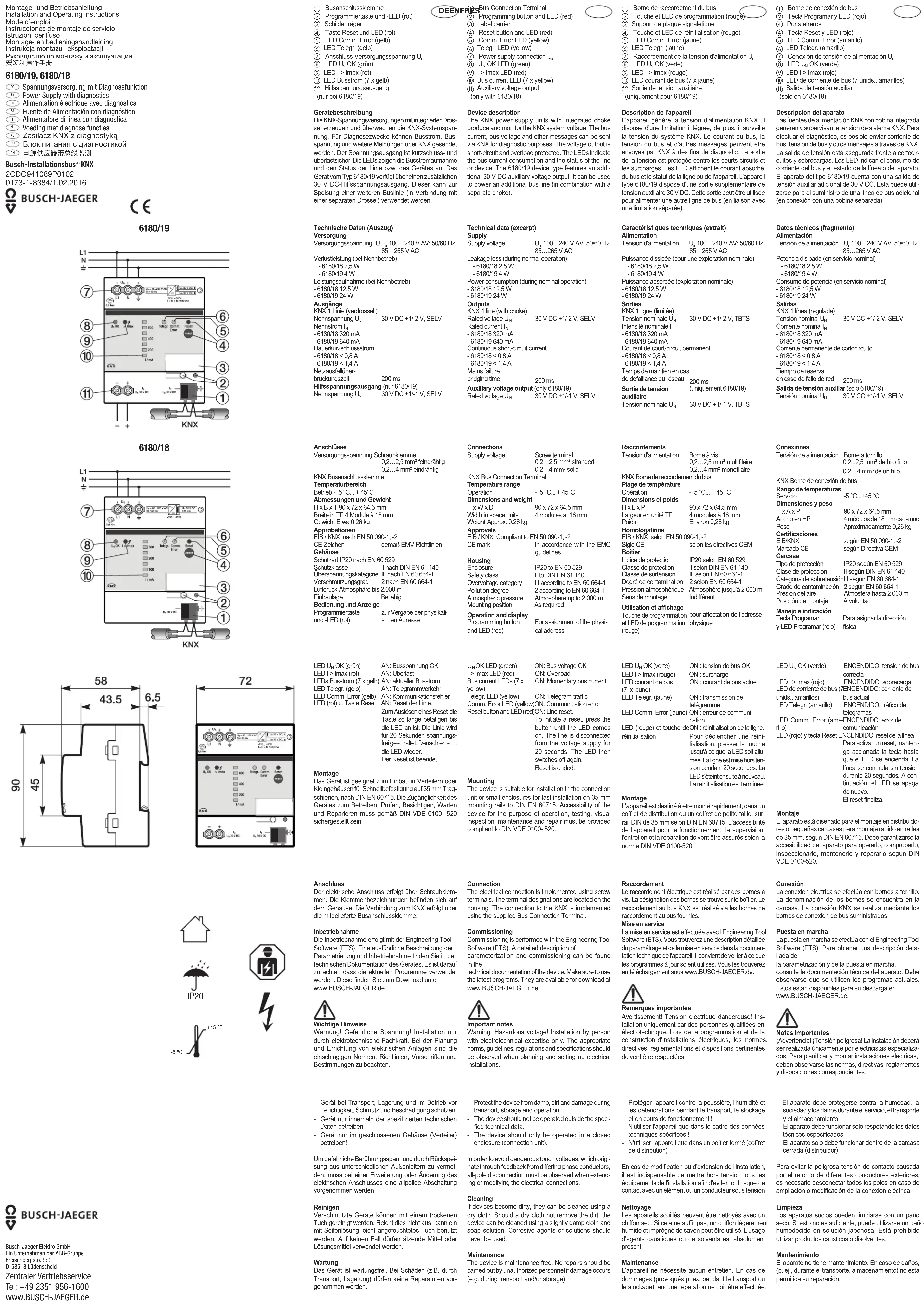 L'appelé générale la tension d'algorithmisation KNX, il dispose d'une limitation intégrée, de plus, il survit la tension du système KNX. Le courant du bus, la tension du bus et d'autres messages peuvent être envoyés par KNX à des fins de diagnostic. La sortie de la tension est protégée contre les courts-circuits et les surcharges. Les LED affichent le courant absorbé du bus et le statut de la ligne ou de l'appelé. L'appelé type 6180/19 dispose d'une sortie supplémentaire de tension auxiliaire 30 V DC. Cette sortie peut être utilisée pour allumer une autre ligne de bus (en liaison avec une limitation séparée).
