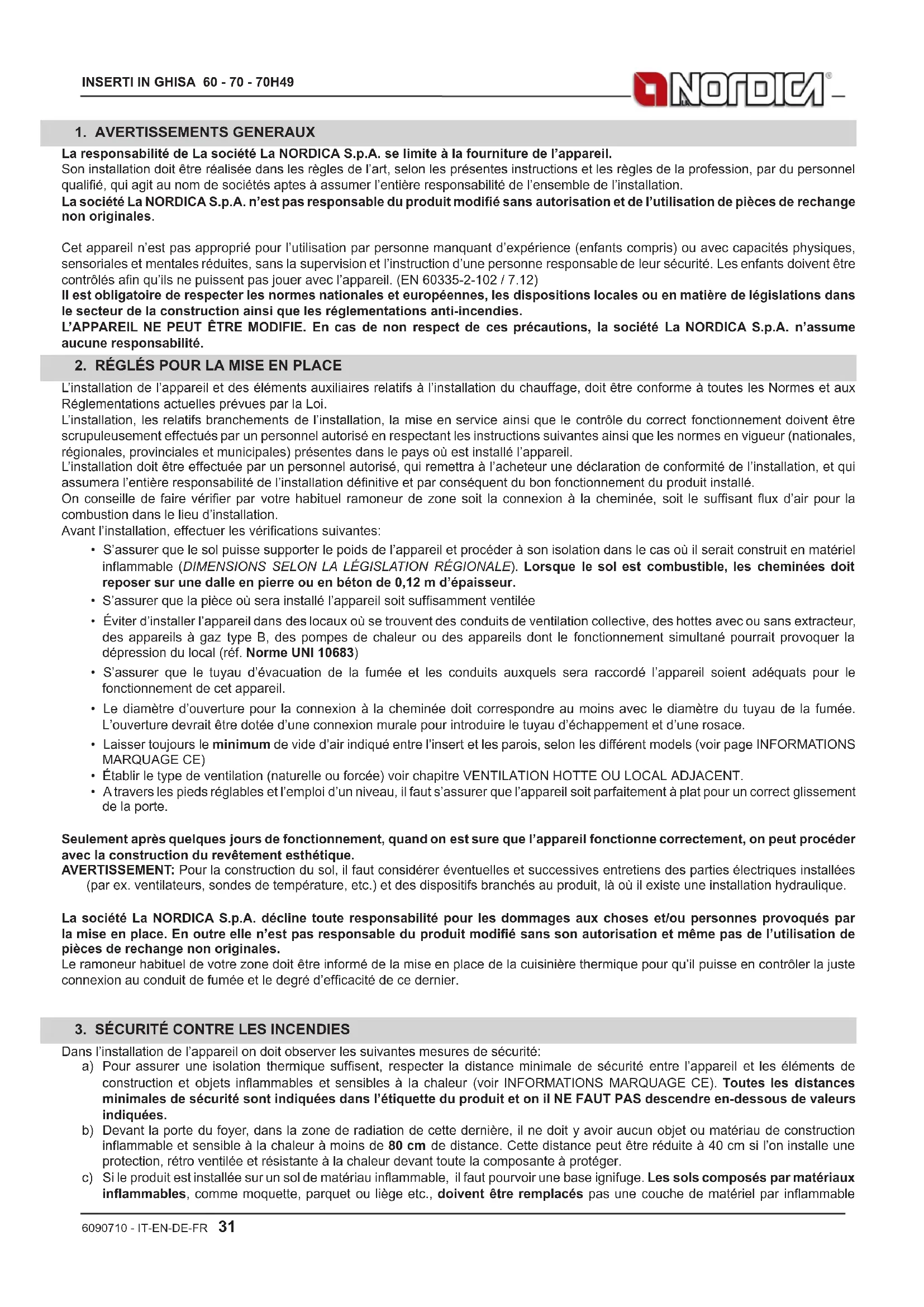 La responsabilité de La société La NORDICA S.p.A. se limite à la fourniture de l’appareil. Son installation doit être réalisée dans les règles de l’art, selon les présentes instructions et les règles de la profession, par du personnel qualié, qui agit au nom de sociétés aptes à assumer l’entière responsabilité de l’ensemble de l’installation. La société La NORDICA S.p.A. n’est pas responsable du produit modié sans autorisation et de l’utilisation de pièces de rechange non originales. Cet appareil n’est pas approprié pour l’utilisation par personne manquant d’expérience (enfants compris) ou avec capacités physiques, sensoriales et mentales réduites, sans la supervision et l’instruction d’une personne responsable de leur sécurité. Les enfants doivent être contrôlés an qu’ils ne puissent pas jouer avec l’appareil. (EN 60335-2-102 / 7.12) Il est obligatoire de respecter les normes nationales et européennes, les dispositions locales ou en matière de législations dans le secteur de la construction ainsi que les réglementations anti-incendies. L’APPAREIL NE PEUT ÊTRE MODIFIE. En cas de non respect de ces précautions, la société La NORDICA S.p.A. n’assume aucune responsabilité.