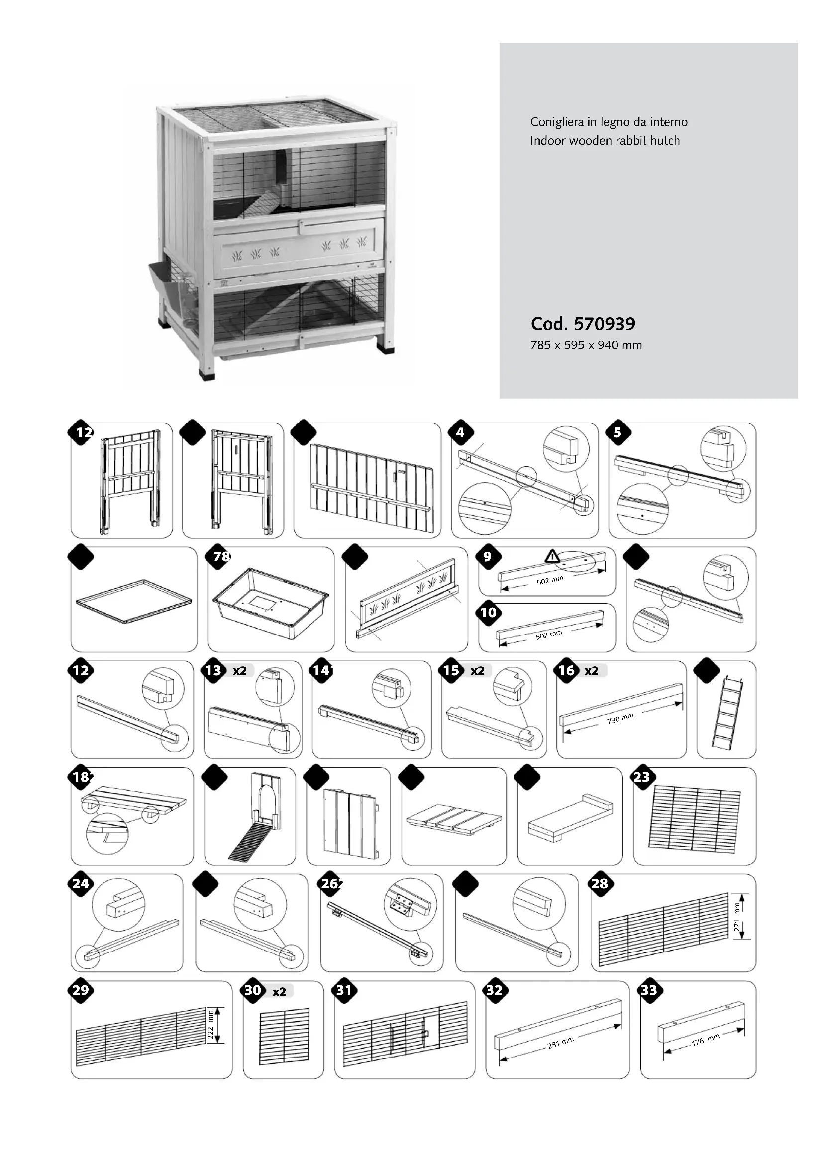 FR - Le produit est adapté aux cobayes et aux lapins; vérifier toute fois que les accessoires, mangeoir et abreuvoir soient toujours accessibles par votre animal. Nous vous conseillons de les fixer au grillage inférieur, si cela n'est pas possible prévoir une échelle à l'intérieur du bac.