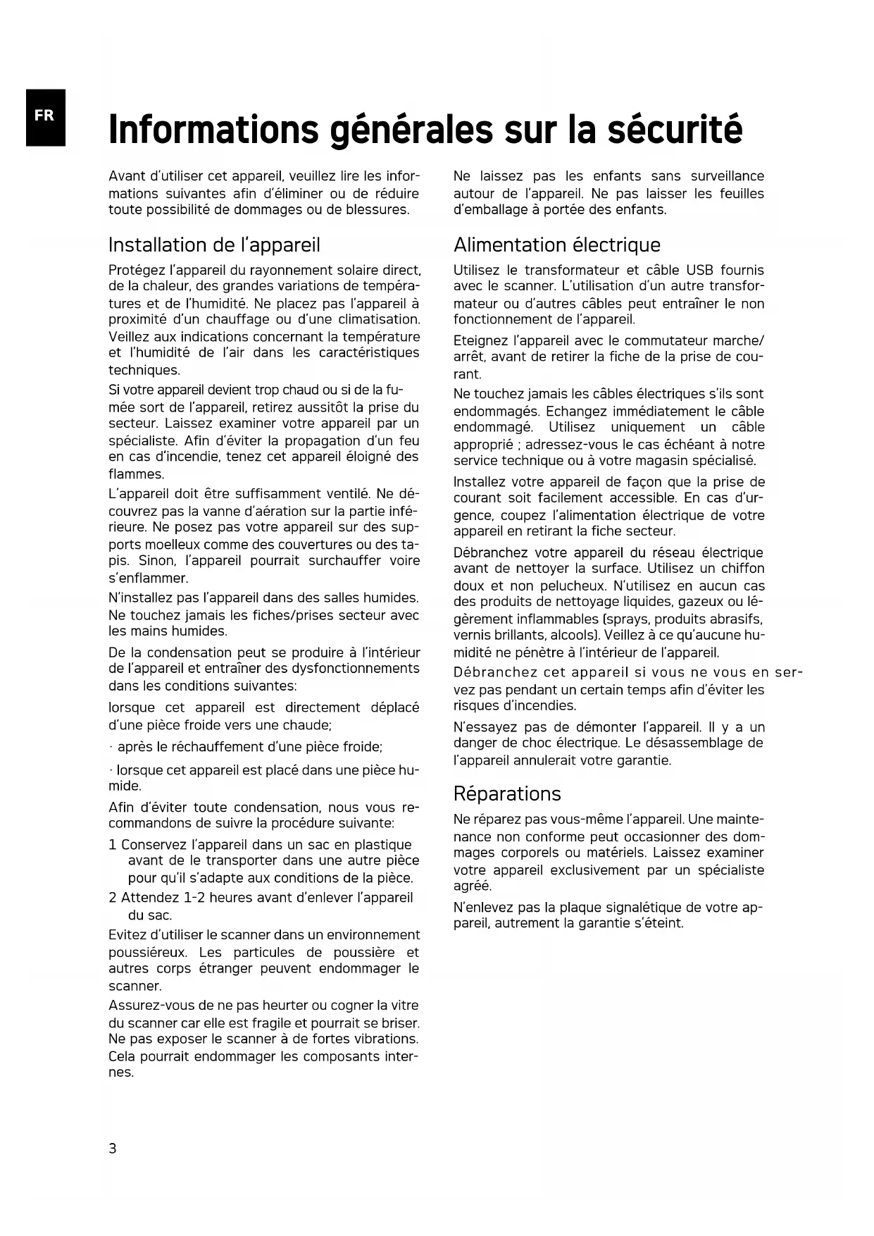 | L’appareil est chaud au toucher • Après une certaine | durée de fonctionnement, la surface atteint env. 30°C à 45 °C. Cela est normal.Si vous sentez une odeur inhabituelle sur l’appareil, ou si la surface est trop chaude, débranchez immédiatement le scanner du réseau électrique et/ou de l’ordinateur / cadre photo numérique. |