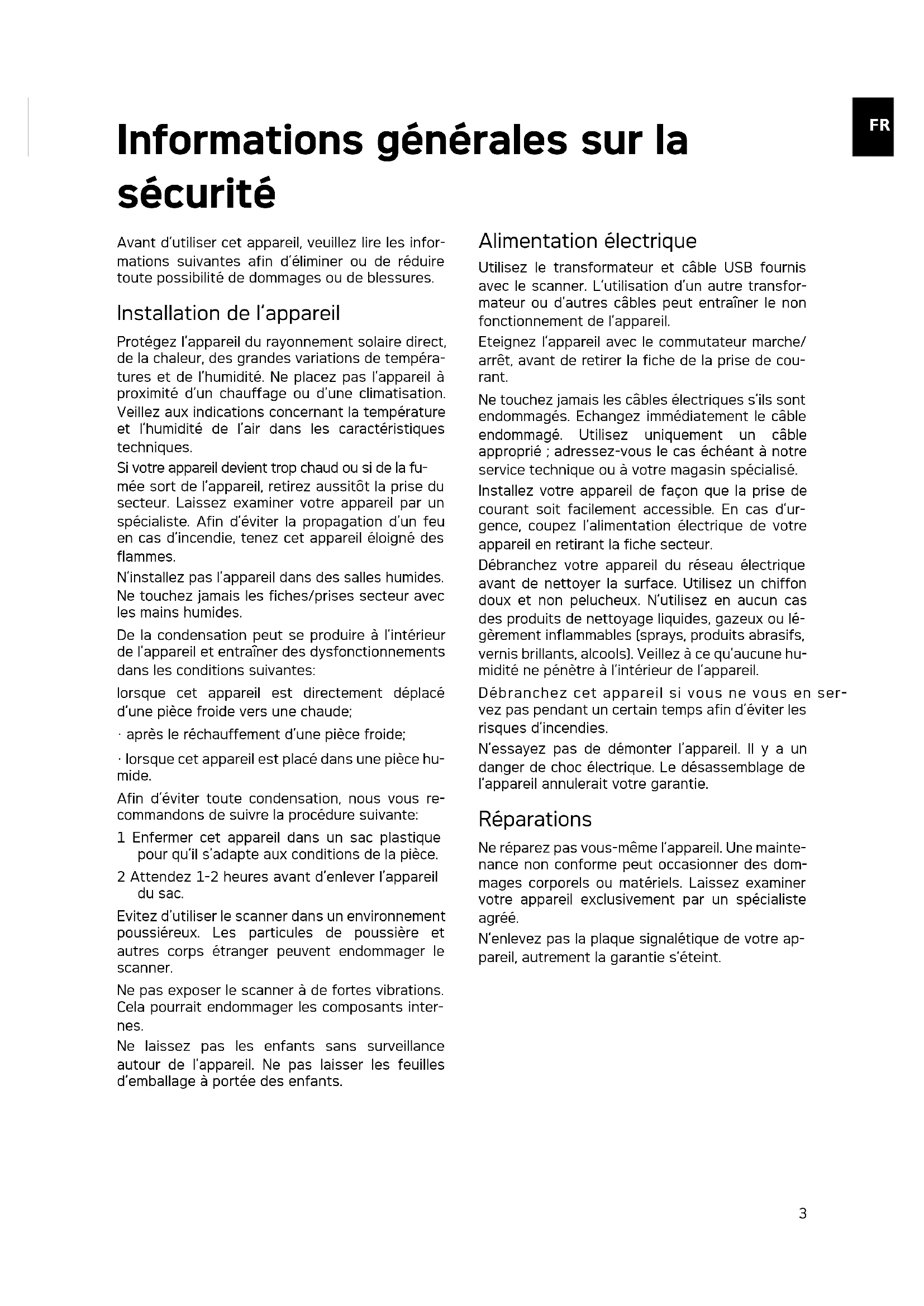 Evitez d'utiliser le scanner dans un environnement poussiéreux. Les particules de poussière et autres corps étranger peuvent endommager le scanner.