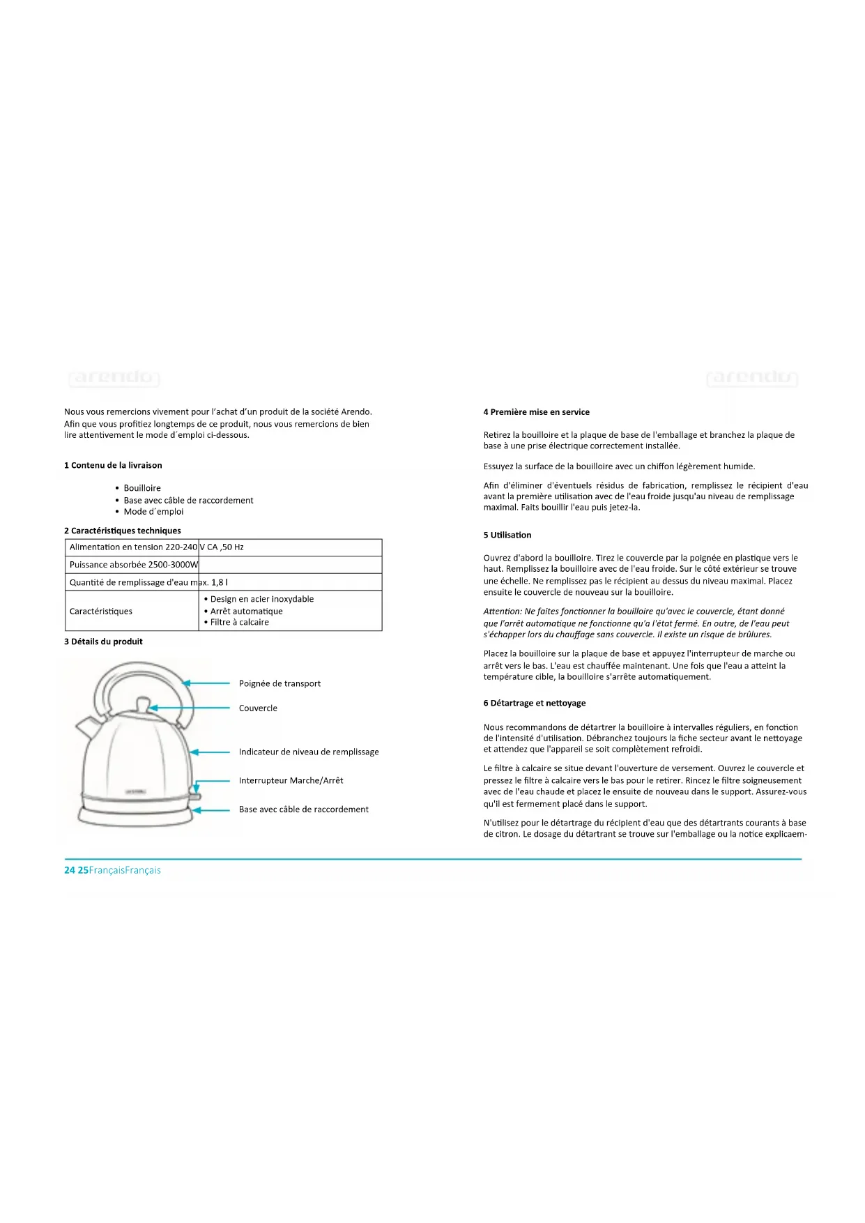 WBA380 - Bouilloire Arendo - Notice d'utilisation et mode d'emploi gratuit