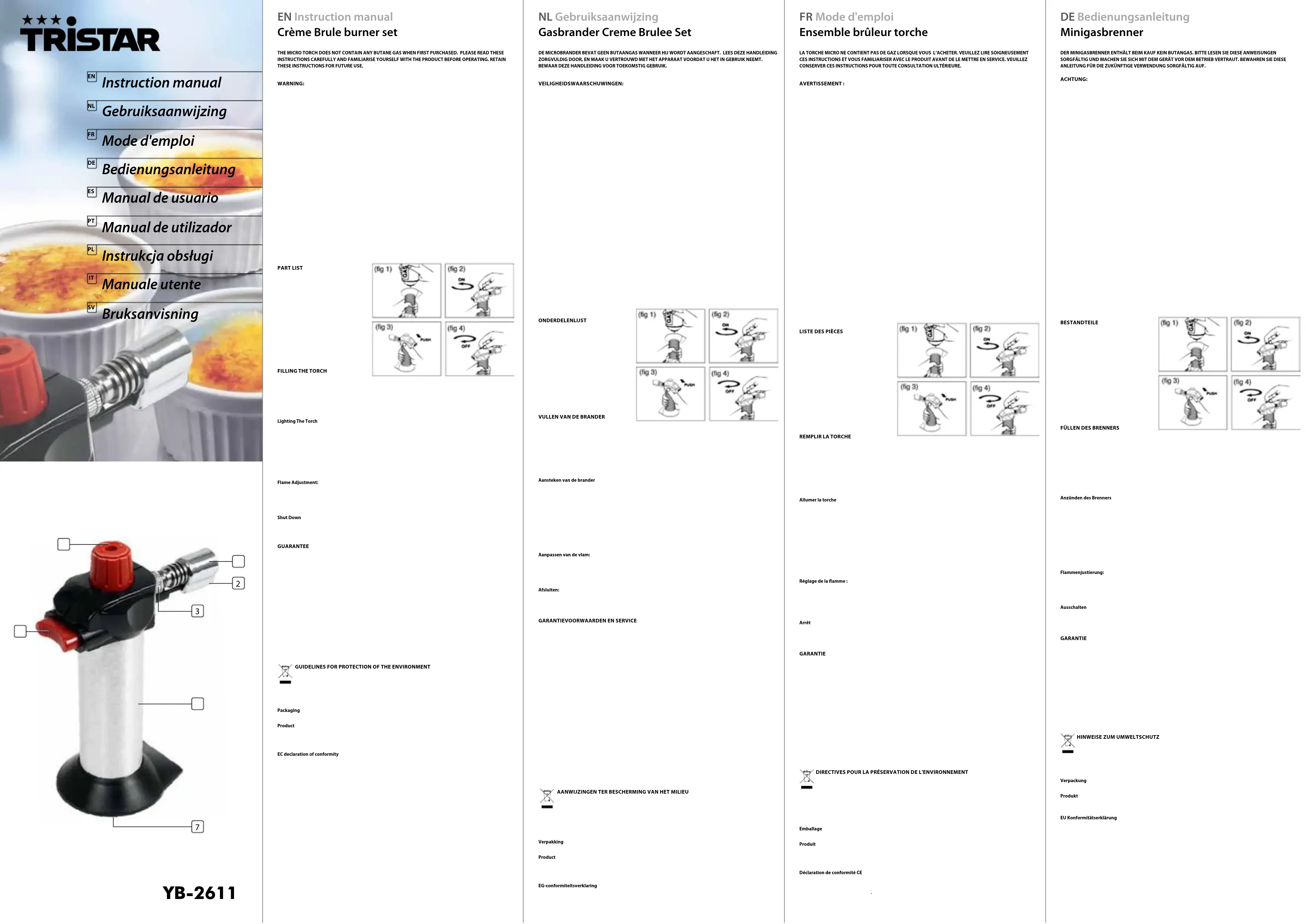 ONDERDELENLIJST1.Vlambeschermer2.Brander3.Luchtregelring4.Gasknop5.Ontstekingsknop6.Standaard7.VulventielVULLEN VAN DE BRANDER•Gebruikalleenhoogwaardigbutaangas.•ZorgervoordathetAAN-/UIT-ventielindestandUITstaat(Afb.4).Draaimetdewijzersvandeklokmeetotdathijstopt.•Keerhetapparaatonderstebovenensteekdevultuitinhetvulventielendrukhem3tot4secondenin.Herhaalditdriekeer.Eenkleinstraaltjenevelvanhetvulventielgeeftaandathetapparaatvolis(Afb.1).•Gebruikgeenverloopnippelsmetdegasbus.Hetventielvandebranderisontworpenomgevuldtewordenmetgasdirectvandegasbus,zonderhetgebruikvanverloopnippels(verloopnippelswordennormaalgesprokengeleverdvoorsigarettenaanstekers).Aansteken van de brander•DraaideAAN-/UIT-knop2/3slagtegendewijzersvandeklokin.Erzalgasuitdebranderstromenmeteenlichtsissen(Afb.2).•Drukdeontstekingsknop.Hetgaszalonmiddellijkontstokenworden(Afb.3).•Alsdebrandernietontbrandt,drukdannogmaalsopdeontstekingsknop.•Alsdebranderdannognietontbrandt,controleerhemdanenzorgervoordatdeluchtregelringdeinlaatopeningnietafdekt.DraaideAAN-/UITknopuitenhouddebranderondereenhoek,zodatuindevoorzijdevandebranderkuntkijken.Drukdeontstekingsknopterwijldegastoevoerisafgesloten;erdienteenvonkovertespringenvandeontstekingspennaardebinnenkantvandebrander.Letop:druknietopdeontstekingsknopalsdebranderinuwrichtingwijst,ofinderichtingvanbrandbarematerialen.Alsereenvonkoverspringt,herhaaldandeontstekingsprocedure.Alsergeenvonkoverspringtishetapparaatdefectendientnietgebruiktteworden.Aanpassen van de vlam:•Pasdevlamvandebranderaantusseneenlengtevan1,25en2,5cm.Eenlangerevlamzalalleenmaarbrandstofverspillen,zonderdatdeeectiviteittoeneemt.•Koelerevlammenkunnenbereiktwordendoorhetaanpassenvandeluchtregelringtotdatdevlamminderwordt.Letop:probeerditniettijdenshetwerken,omdatdeluchtregelringheetzalzijn.Afsluiten: DraaideAAN-/UIT-knopmetdewijzersvandeklokmeetotdatdevlamdooft(Afb.4).Zorgervoordatdevlamuitisendatdebranderafgekoeldisvoordatuhemopbergt. GARANTIEVOORWAARDEN EN SERVICE•Bijschadeveroorzaaktdoorhetnietopvolgenvandegebruiksaanwijzing,vervalthetrechtopgarantie!Voorvervolgschadediehieruitontstaatzijnwijnietaansprakelijk.•Voormateriëleschadeofpersoonlijkletselveroorzaaktdoorondeskundiggebruikofhetnietopvolgenvandeveiligheidsvoorschriftenzijnwijnietaansprakelijk.Indergelijkegevallenvervaltelkeaanspraakopgarantie.•Andersdanhetschoonmaken,zoalsgenoemdindezehandleiding,isaanditapparaatgeenanderonderhoudnoodzakelijk.•Indienerreparatiesmoetenwordenuitgevoerd,magdituitsluitenddooreengeautoriseerdbedrijfgebeuren.•DitapparaatisalleenbedoeldvoorHUISHOUDELIJKgebruikennietvoorcommercieelofindustrieelgebruik.•Hetproductmagnietwordengewijzigdofveranderd.•Indienzichproblemenzoudenvoordoengedurende2jaarnaaankoopdatum,welkegedektzijndoordefabrieksgarantie,zalTRISTARhetapparaatreparerenofvervangen.•Uitsluitendmateriaal-en/offabricagefoutenzijnvoorbegrepenindezegarantie.•TRISTARisnietverantwoordelijkvoorschade:1)Tengevolgevaneenvalofongeluk.2)Indienhetapparaattechnischisgewijzigddoorgebruikerofderden.3)Dooroneigenlijkgebruikvanhetapparaat.4)Doornormalegebruiksslijtage.•Dooreventuelereparatiewordtdeoorspronkelijkegarantieperiodevan2jaarnietverlengd.DezegarantieisslechtsgeldigopEuropeesgrondgebied.DezegarantieheftdegebruikersrechtenvolgensEuropeserichtlijn1944/44CEnietop.•Voorvragenofklachtenkuntzichmeldenbijuwverkooppunt.•Bewaaraltijduwaankoopbewijs,zonderditaankoopbewijskuntugeenaanspraakmakenopenigevormvangarantie.AANWIJZINGEN TER BESCHERMING VAN HET MILIEUDitproductmagaanheteindevanzijnlevensduurnietbijhetnormalehuisafvalwordengedeponeerd,maardientbijeenspeciaalinzamelpuntvoorhethergebruikvanelektrischeenelektronischeapparatentewordenaangeboden.Hetsymboolopartikel,gebruiksaanwijzingenverpakkingattendeertuhierop.Degebruiktegrondstoenzijngeschiktvoorhergebruik.Methethergebruikvangebruikteapparatenofgrondstoenlevertueenbelangrijkebijdragevoordebeschermingvanonsmilieu.Informeerbijuwlokaleoverheidnaarhetbedoeldeinzamelpunt.VerpakkingHetverpakkingsmateriaalis100%recyclebaar,leverhetverpakkingsmateriaalgescheidenin.ProductDitapparaatisvoorzienvanhetmerktekenvolgensdeEuropeserichtlijn2002/96/EGInzakeAfgedankteelektrischeenelektronischeapparaten(AEEA).Doorervoortezorgendatditproductopdejuistemanieralsafvalwordtverwerkt,helptumogelijknegatieveconsequentiesvoorhetmilieuendemenselijkegezondheidtevoorkomen.EG-conformiteitsverklaringDitapparaatisontworpen,vervaardigdenindehandelgebrachtinovereenstemmingmet:deveiligheidsdoeleindenvande“laagspanningsrichtlijn”nr.73/23/EG,debeschermingsvoorschriftenvandeEMC-richtlijn89/336/EG“Electromagnetischecompatibiliteit”endevereistevanrichtlijn93/68/EG.LA TORCHE MICRO NE CONTIENT PAS DE GAZ LORSQUE VOUS L’ACHETER. VEUILLEZ LIRE SOIGNEUSEMENT CES INSTRUCTIONS ET VOUS FAMILIARISER AVEC LE PRODUIT AVANT DE LE METTRE EN SERVICE. VEUILLEZ CONSERVER CES INSTRUCTIONS POUR TOUTE CONSULTATION ULTÉRIEURE.AVERTISSEMENT :•Veuillezliretouteslesinstructionsavantd’utilisercetappareil.Veuillezconservercesinstructionspourtouteconsultationultérieure.•Veuillezutiliseruncombustiblebutanelégerdequalitéuniquement.•Mettezlatorcheetlacartouchedegazàl’abridelaportéedesenfants.•Nepasutiliserl’appareils’ilmontredesdommagesvisibles.•Lebutaneesttrèsinammable–veuillezmanipuleravecsoin.•Remplissezleréservoirdansunendroitbienaéréloindescombustibles.Nepasfumerlorsquevousremplacezourechargerl’appareil.•Avantderemplirl’appareil,veuillezlirelesinstructionsapposéessurlacartouchedegaz.•Veillezàavoirunextincteuràproximitélorsquevousutilisezlatorche.•Démonter,modierouajouterdespiècesàlatorchepeuts’avérerdangereux.•Nejamaistenterderéparerlatorche.Veuillezl’emmenerdansuncentrederéparationapproprié.•Veuillezutiliseruncombustiblegazbutanedequalitéuniquement.•Nepasperceroubrûlerlescartouchesdegazmêmesicesdernièressontvides.•Lescartouchesdegazvidesdoiventêtrerecycléeslorsquecelaestpossible.Veuillezvousrenseignerauprèsdevotremunicipalitépourplu