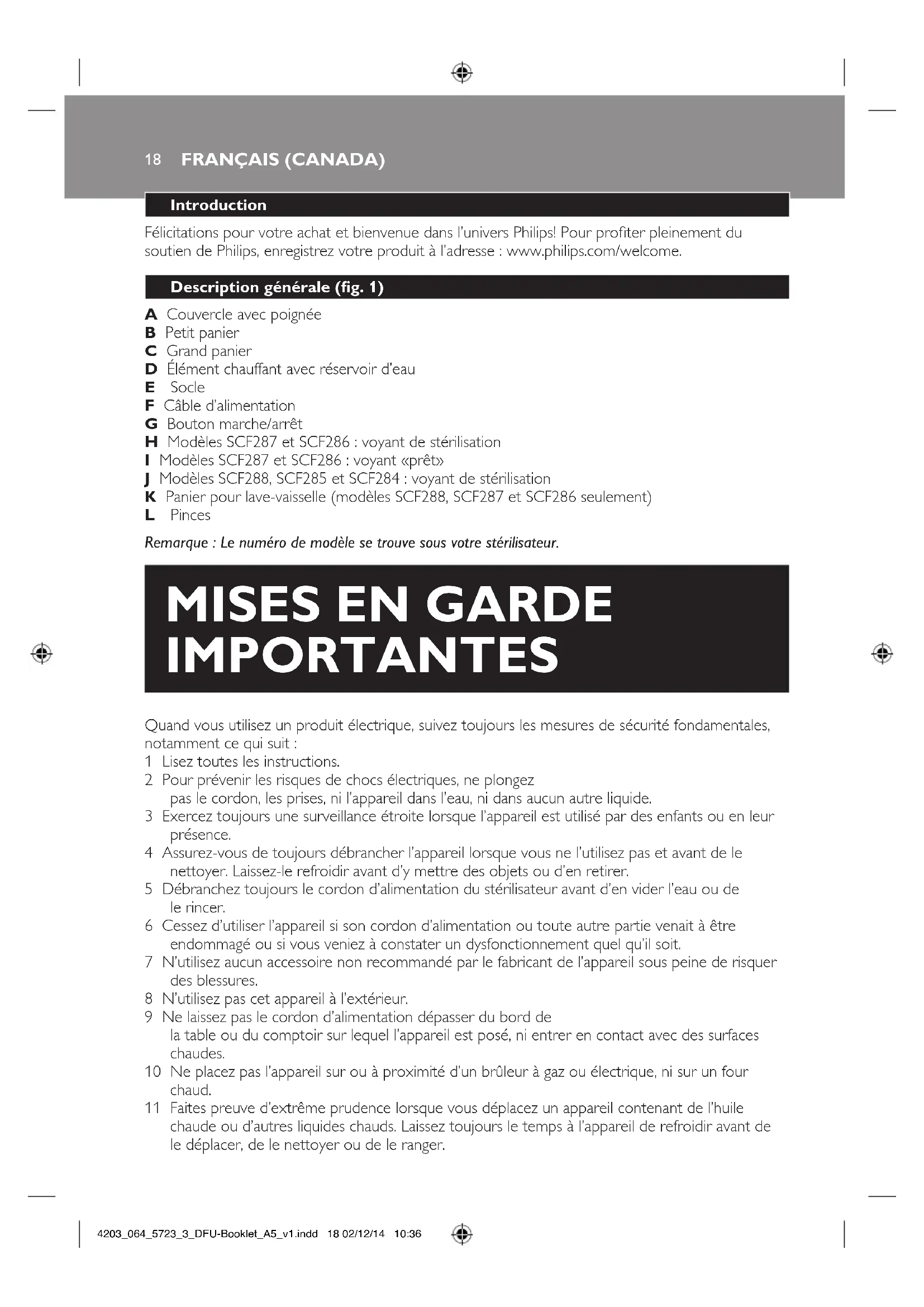 IMPORTANTES 4203_064_5723_3_DFU-Booklet_A5_v1.indd 18 02/12/14 10:3612 Débranchez toujours l’appareil immédiatement après utilisation. 13 N’utilisez l’appareil pour aucun autre usage que celui prévu. 14 EN COURS D’UTILISATION, LE STÉRILISATEUR CONTIENT DE L’EAU BOUILLANTE ET DE LA VAPEUR S’ÉCHAPPE DE L’ÉVENT DU COUVERCLE. 15 Veillez à ce que le stérilisateur soit posé de façon bien stable sur une surface plane lorsque vous l’utilisez. 16 Ne déplacez et n’ouvrez jamais l’appareil en cours d’utilisation. 17 Gardez l’appareil hors de portée des enfants. 18 Ne posez jamais d’objets sur le stérilisateur. 19 Pour arrêter le stérilisateur en cours de cycle, débranchez son cordon d’alimentation de la prise. 20 Soyez prudent au moment de l’ouverture car la vapeur peut causer des brûlures. 21 N’utilisez aucun produit chimique de stérilisation ou de javellisation sur votre stérilisateur à vapeur, ni sur les objets que vous souhaitez stériliser. 22 N’utilisez pas de produit abrasif ou antibactérien, ni de tampon à récurer pour nettoyer le stérilisateur. 23 N’utilisez pas d’eau adoucie dans le stérilisateur. 24 Le cordon d’alimentation fourni est délibérément court pour éviter qu’il ne s’emmêle ou qu’il ne puisse être accroché involontairement. 25 Vous pouvez toutefois utilisez des rallonges en redoublant de vigilance. 26 Si vous souhaitez utiliser une rallonge, vériez que ses caractéristiques électriques sont aussi élevées que celles de l’appareil. Assurez-vous également qu’elle ne repose pas en bord de table où un enfant pourrait facilement l’attraper. La rallonge utilisée doit être un câble à trois ls avec mise à la terre. 27 Le non respect des instructions de détartrage peut engendrer des dommages irréversibles. 28 Ce stérilisateur ne comprend aucune pièce réparable. Ne tentez pas de l’ouvrir ou de le réparer par vous-même. 29 Ne touchez pas les surfaces chaudes, mais servez-vous des poignées ou boutons. 30 CET APPAREIL EST DESTINÉ À UN USAGE DOMESTIQUE UNIQUEMENT. 31 Avant de brancher l’appareil, vériez si la tension admissible indiquée dessus correspond à celle de l’endroit où vous vous trouvez. 32 N’allumez jamais le stérilisateur électrique à vapeur avant de verser de l’eau dans son réservoir. 33 Ne stérilisez pas d’objets de très petite taille qui risqueraient de passer à travers les trous des conteneurs. 34 Évitez d’utiliser des additifs homéopathiques dans l’eau, car ils peuvent nuire à la vapeur et à la santé, mais aussi endommager les petites pièces en plastique. CONSERVEZ CES CONSIGNES Avertissement - N’utilisez jamais d’accessoires, ni de pièces d’autres fabricants ou qui n’ont pas été spéciquement recommandés par Philips. Votre garantie ne sera plus valable en cas d’utilisation de tels accessoires ou pièces. - Utilisez de l’eau distillée, en bouteille ou du robinet, sans y mélanger d’additif. - Ne versez pas de produit javellisant ou chimique dans l’appareil.