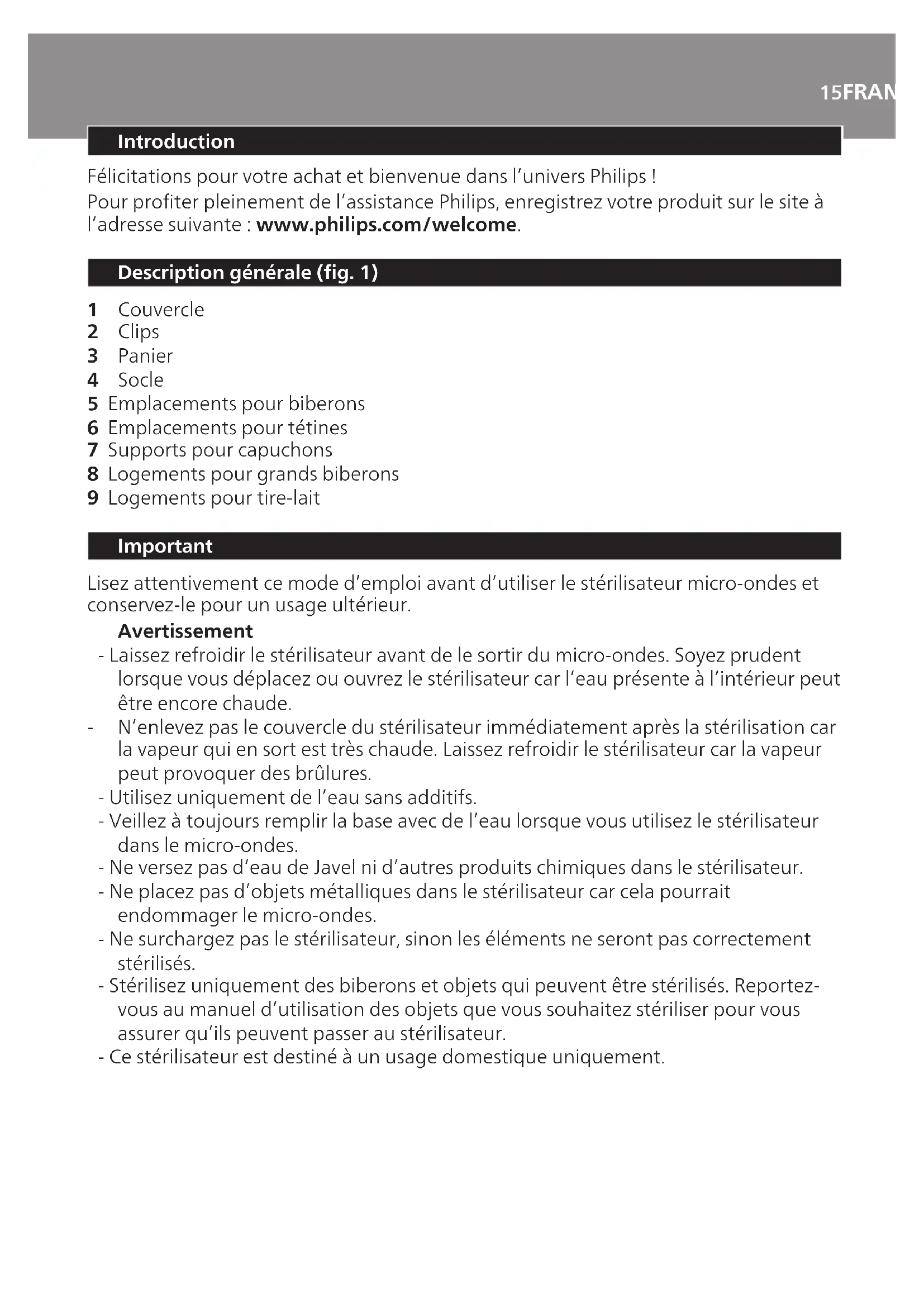 N’enlevez pas le couvercle du stérilisateur immédiatement après la stérilisation car la vapeur qui en sort est très chaude. Laissez refroidir le stérilisateur car la vapeur peut provoquer des brûlures. - Utilisez uniquement de l’eau sans additifs. - Veillez à toujours remplir la base avec de l’eau lorsque vous utilisez le stérilisateur dans le micro-ondes. - Ne versez pas d’eau de Javel ni d’autres produits chimiques dans le stérilisateur. - Ne placez pas d’objets métalliques dans le stérilisateur car cela pourrait endommager le micro-ondes. - Ne surchargez pas le stérilisateur, sinon les éléments ne seront pas correctement stérilisés. - Stérilisez uniquement des biberons et objets qui peuvent être stérilisés. Reportez- vous au manuel d’utilisation des objets que vous souhaitez stériliser pour vous assurer qu’ils peuvent passer au stérilisateur. - Ce stérilisateur est destiné à un usage domestique uniquement.16 FRANÇAIS Attention - Veillez à ce que les enfants ne jouent pas avec le stérilisateur. - Veillez à toujours remplir la base avec 200 ml d’eau avant de commencer à stériliser. - Après chaque utilisation, videz le restant d’eau du stérilisateur une fois l’eau refroidie. - Laissez toujours refroidir le stérilisateur avant de le ranger. - Lavez-vous toujours les mains avant de toucher les objets stérilisés. - N’exposez pas le stérilisateur à des températures élevées ni au soleil. - Ne placez jamais le stérilisateur sur une surface chaude. - Si vous utilisez un four combiné (avec fonction gril), assurez-vous que le four ou le gril est éteint et a refroidi avant d’y placer le stérilisateur. Avant la première utilisation Avant la première utilisation du stérilisateur, nettoyez-le soigneusement comme décrit ci-dessous. 1 Sortez le panier de la base. 2 Remplissez un biberon ou une mesure graduée d’exactement 200 ml d’eau du robinet et versez-les dans la base (g. 2). La quantité d’eau doit être d’exactement 200 ml. Si la base contient trop d’eau, les objets ne seront pas correctement stérilisés. Si la base ne contient pas susamment d’eau, cela peut endommager le stérilisateur ou le micro-ondes. 3 Placez le panier dans la base (g. 3). 4 Mettez le couvercle sur le stérilisateur (1) et abaissez les clips pour verrouiller le couvercle (2). (g. 4) 5 Placez le stérilisateur dans le micro-ondes. (g. 5) Remarque : Assurez-vous que le micro-ondes est propre et sec avant de commencer à stériliser. Remarque : Si vous utilisez un four combiné, assurez-vous que le four ou le gril est éteint et a refroidi avant d’y placer le stérilisateur. 6 Sur le micro-ondes, sélectionnez la puissance en watts et la durée appropriées (voir le tableau du chapitre « Utilisation du stérilisateur micro-ondes »), puis mettez-le en marche. 7 Lorsque le micro-ondes a terminé, ouvrez-le et laissez refroidir le stérilisateur avant de l’enlever du micro-ondes. 8 Relevez les clips (1) et enlevez le couvercle (2) (g. 6). 9 Videz l’eau restante et rincez soigneusement la base et le panier.17FRANÇAIS Avant l’utilisation Remplissage du panier Avant de placer les objets à stériliser dans le panier, nettoyez-les soigneusement au lave-vaisselle ou à la main avec de l’eau chaude et un peu de liquide vaisselle. Veillez à éliminer tout résidu de lait. Remarque : Assurez-vous que tous les objets à stériliser sont correctement démontés et mettez-les dans le panier. Orientez leur partie ouverte vers le bas pour éviter qu’ils ne se remplissent d’eau. Remarque : N’empilez pas les objets trop près les uns des autres. La vapeur doit pouvoir circuler autour des objets pour garantir une stérilisation ecace. Il y a plusieurs façons de remplir le panier : Quatre biberons Philips AVENT 1 Placez les biberons tête en bas dans les emplacements prévus à cet eet. (g. 7) 2 Placez les tétines dans les emplacements prévus à cet eet (g. 8). 3 Placez les bagues d’étanchéité sur les tétines, sans serrer (g. 9). Remarque : Les plus grandes bagues d’étanchéité ne tiennent que si elles sont placées en position inclinée sur les tétines. 4 Placez les capuchons dans les supports prévus à cet eet (g. 10). Deux grands biberons Philips AVENT (330 ml/11 oz) 1 Insérez le bord des biberons dans les logements pour grands biberons (g. 11). 2 Placez les tétines dans les emplacements prévus à cet eet (g. 12). 3 Placez les bagues d’étanchéité sur les tétines, sans serrer (g. 13). Remarque : Les plus grandes bagues d’étanchéité ne tiennent que si elles sont placées en position inclinée sur les tétines. 4 Placez les capuchons dans les supports prévus à cet eet (g. 14). Quatre récipients et couvercles Philips AVENT 1 Placez les récipients tête en bas dans le panier (g. 15). 2 Placez les couvercles verticalement autour des biberons. (g. 16) Deux tire-lait Philips AVENT et deux biberons Philips AVENT Ne placez pas les composants électriques dans le stérilisateur. 1 Désassemblez entièrement le tire-lait. 2 Insérez le bord du corps du tire-lait dans les emplacements pour tire-lait au fond du panier (g. 17). 3 Placez les biberons tête en bas dans les emplacements prévus à cet eet (g. 18).18 FRANÇAIS 4 Placez les composants non électriques restants du tire-lait dans un espace dégagé du panier (g. 19). Remarque : Assurez-vous que la vapeur peut circuler autour de ces composants. Utilisation du stérilisateur micro-ondes Ne placez dans le stérilisateur que des objets qui peuvent être stérilisés. Ne stérilisez pas votre goupillon ou des objets renfermant du liquide, comme un anneau de dentition contenant un liquide froid apaisant. Remarque : Nettoyez les biberons ou autres objets avant de les stériliser. 1 Sortez le panier de la base. 2 Remplissez un biberon ou une mesure graduée d’exactement 200 ml d’eau du robinet et versez-les dans la base (g. 2). La quantité d’eau doit être d’