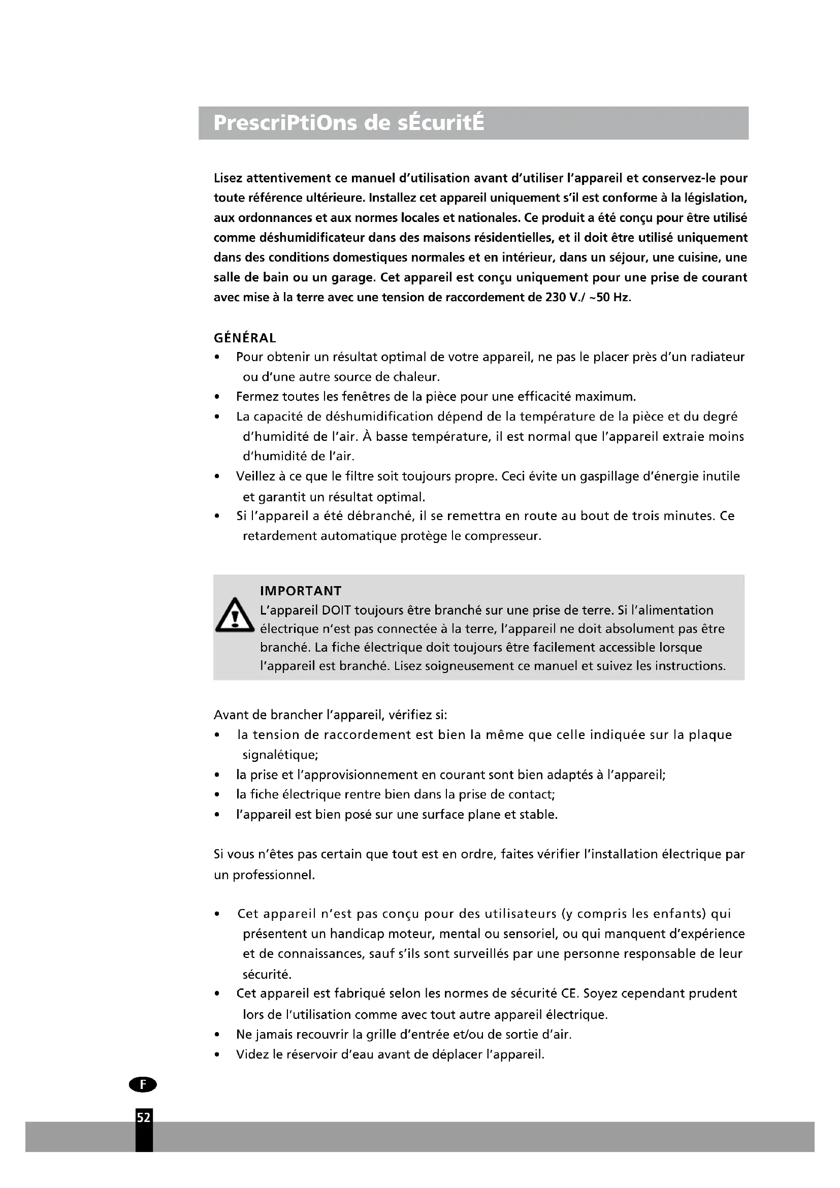 PrescriPtiOns de sécurité Lisez attentivement ce manuel d’utilisation avant d’utiliser l’appareil et conservez-le pour toute référence ultérieure. Installez cet appareil uniquement s’il est conforme à la législation, aux ordonnances et aux normes locales et nationales. Ce produit a été conçu pour être utilisé comme déshumidificateur dans des maisons résidentielles, et il doit être utilisé uniquement dans des conditions domestiques normales et en intérieur, dans un séjour, une cuisine, une salle de bain ou un garage. Cet appareil est conçu uniquement pour une prise de courant avec mise à la terre avec une tension de raccordement de 230 V./ ~50 Hz.