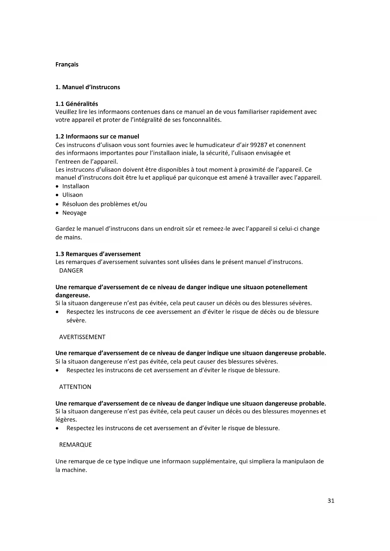 Ces instructions d’utilisation vous sont fournies avec le humudificateur d’air 99287 et contiennent des informations importantes pour l’installation initiale, la sécurité, l’utilisation envisagée et l'entretien de l’appareil. Les instructions d’utilisation doivent être disponibles à tout moment à proximité de l’appareil. Ce manuel d’instructions doit être lu et appliqué par quiconque est amené à travailler avec l’appareil. Installation Utilisation Résolution des problèmes et/ou Nettoyage Gardez le manuel d’instructions dans un endroit sûr et remettez-le avec l’appareil si celui-ci change de mains.