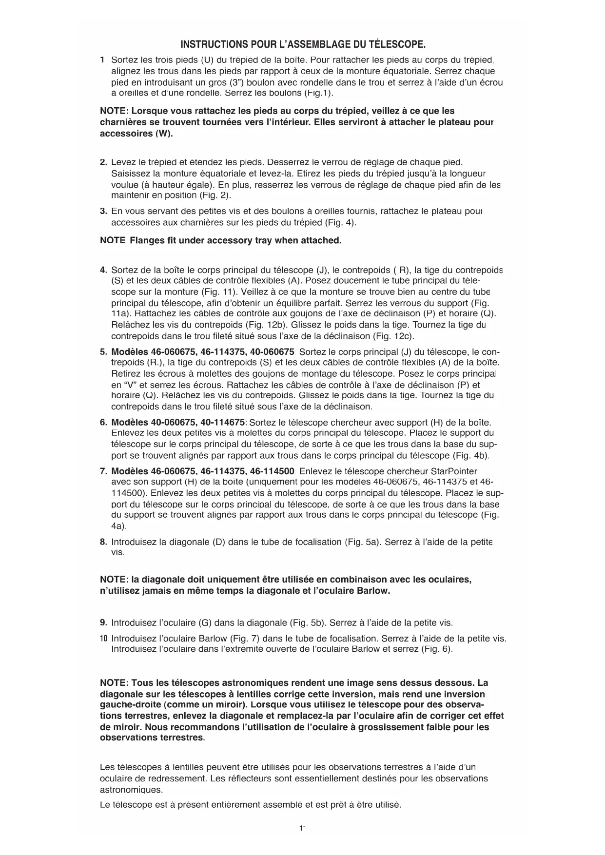 Introduisez lʼoculaire Barlow (Fig. 7) dans le tube de focalisation. Serrez à lʼaide de la petite vis. Introduisez lʼoculaire dans lʼextrémité ouverte de lʼoculaire Barlow et serrez (Fig. 6). NOTE: Tous les télescopes astronomiques rendent une image sens dessus dessous. La diagonale sur les télescopes à lentilles corrige cette inversion, mais rend une inversion gauche-droite (comme un miroir). Lorsque vous utilisez le télescope pour des observa- tions terrestres, enlevez la diagonale et remplacez-la par lʼoculaire afin de corriger cet effet de miroir. Nous recommandons lʼutilisation de lʼoculaire à grossissement faible pour les observations terrestres. Les télescopes à lentilles peuvent être utilisés pour les observations terrestres à lʼaide dʼun oculaire de redressement. Les réflecteurs sont essentiellement destinés pour les observations astronomiques. Le télescope est à présent entièrement assemblé et est prêt à être utilisé. 11ATTENTION: Lʼobservation du soleil peut entraîner des lésions permanentes aux yeux. Nʼobservez jamais le soleil ni à travers ce télescope, ni à lʼœil nu.