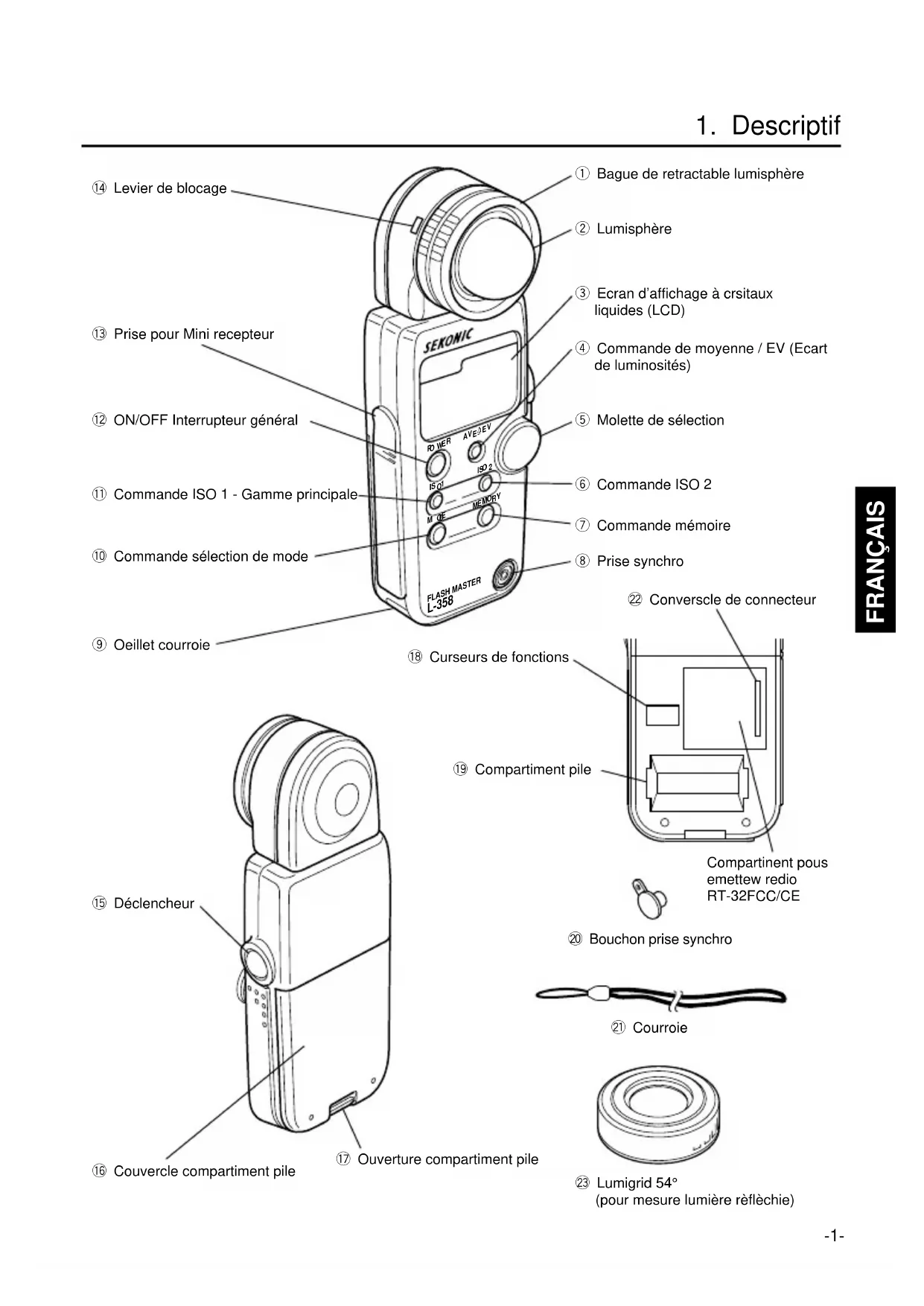- FRANÇAIS Toutes nos félicitations pour l’achat du Sekonic L-358 Flash Master Le Sékonic L-358 Flash Master est le dernier-né de la gamme Sékonic, leader dans sa spécialité depuis 40 ans. Il a été conçu pour être le meilleur des instruments de mesure consacrés aux Professionnels. Il est anti-ruissellement et résiste à toute moisissure par sa conception. On peut l’utiliser sous la pluie mais pas dans l’eau. Il possède un écran à affichage LCD digital; de lecture aisée, rétro-éclairé dès que l’environnement s’assombri. Pour ne pas multiplier les contrôles, quatre fonctions , moins utilisées, sont pré- sélectionnées par des curseurs, situés dans le compartiment pile. Comme le L-358 a des caractéristiques importantes, il requiert un mode d’emploi important. Le L-358 a été soumis a des contrôles de fabrication très stricts. Il faut lire très soigneusement ce mode d’emploi afin de tirer avantage des fonctions évoluées. Sekonic vou remercie pour votre confiance.Table des Matières 1. Descriptif p. 1