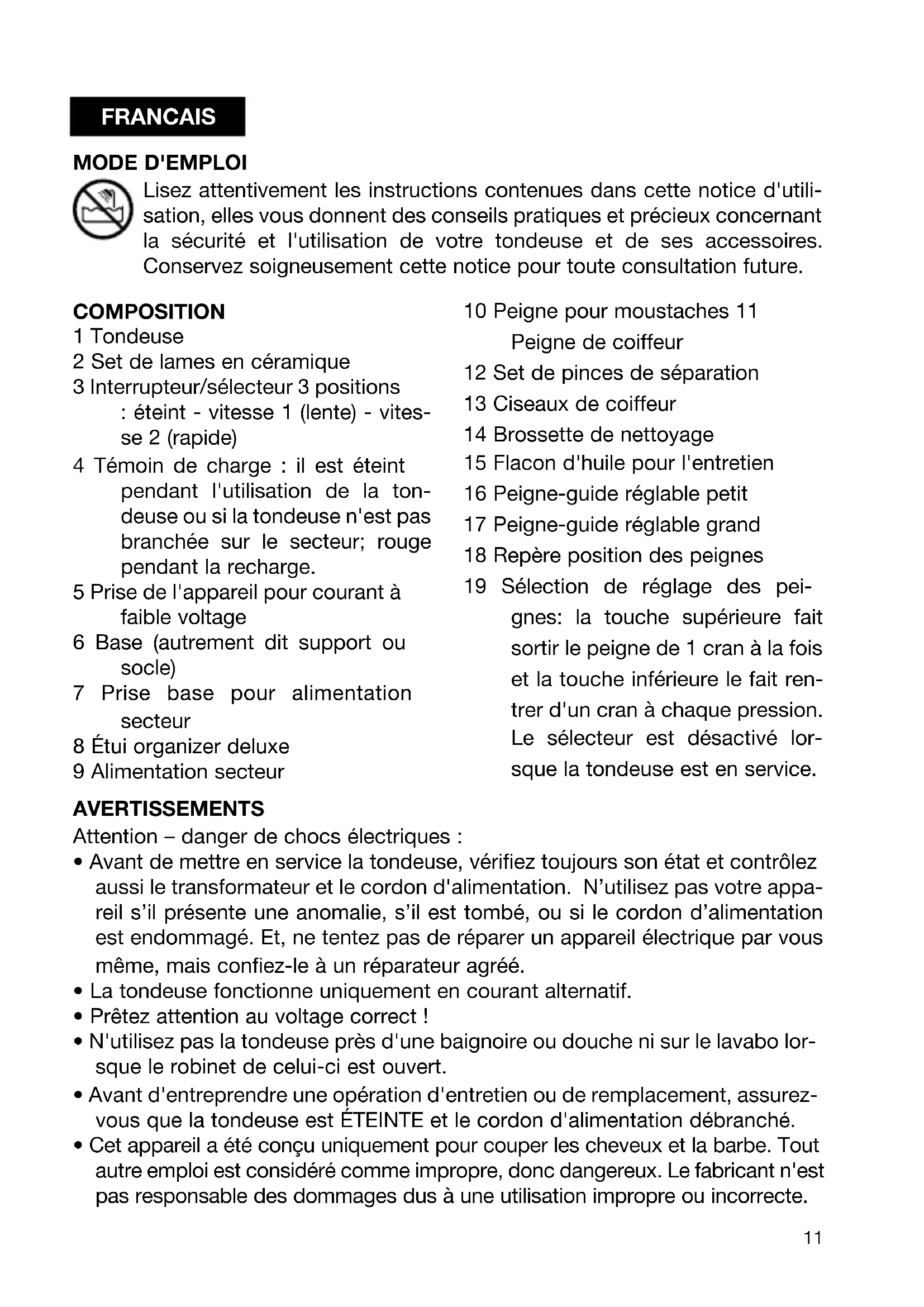 - N'utilisez pas la tondeuse près d'une baignoire ou douche ni sur le lavabo lor- sque le robinet de celui-ci est ouvert.