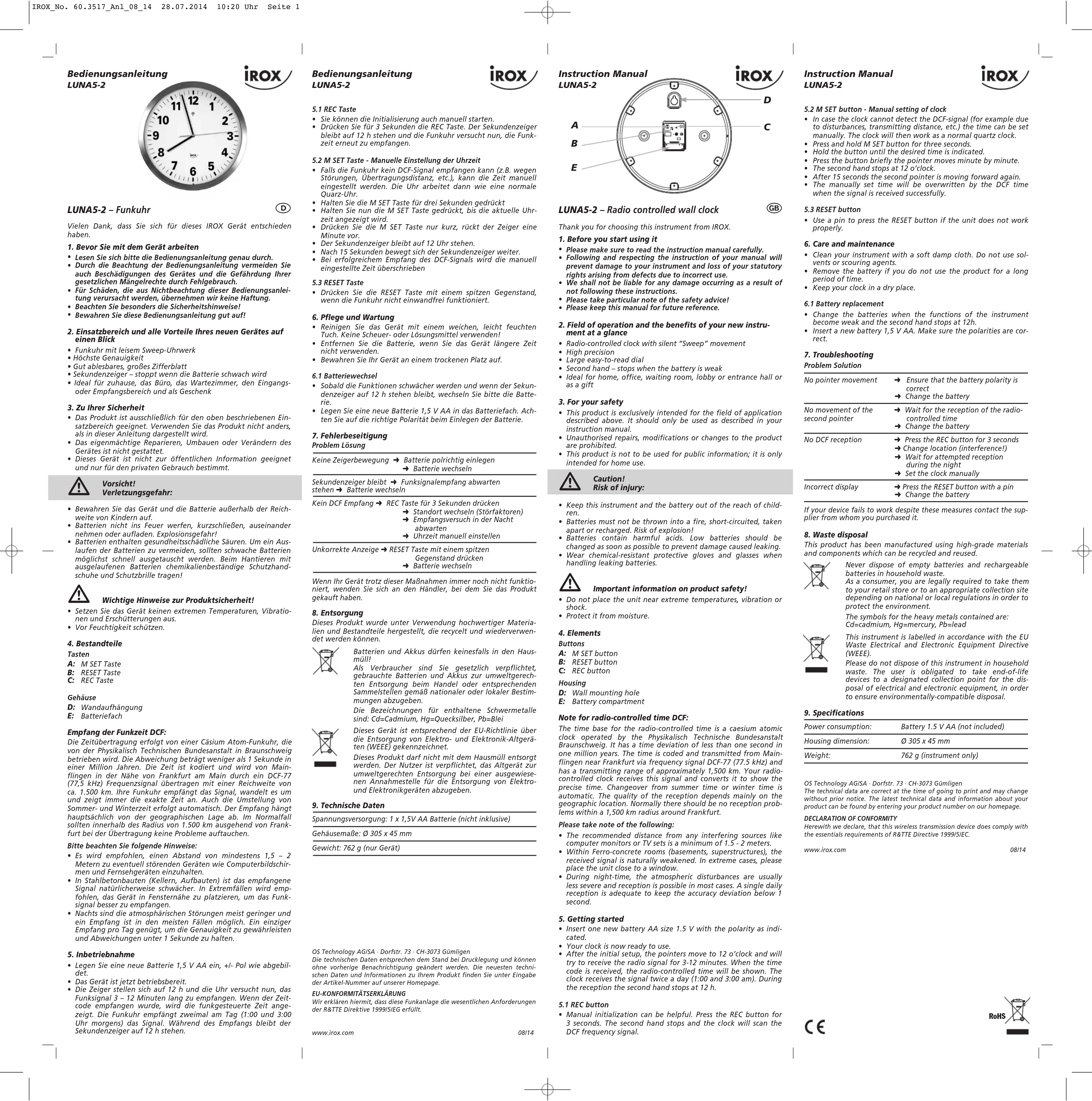 Nous vous remercions d'avoir choisi l'appareil IROX. 1. Avant d'utiliser l'appareil Lisez attentivement le mode d'emploi. En respectant ce mode d'emploi, vous éviterez d'endommagerl'appareil et de perdre vos droits résultant d'un défaut pourcause d'utilisation non-conforme. Nous n'assumons aucuneresponsabilité pour des dommages qui auraient été causés parle non-respect du présent mode d'emploi. Suivez bien toutes les consignes de sécurité! Conservez soigneusement le mode d'emploi!2. Aperçu du domaine d'utilisation et tous les avantages devotre nouvel appareil Horloge radio-pilotée avec mouvement silencieux «Sweep»• Haute précision• Grand cadran bien lisible • Aiguille des secondes – elle s'arrête lorsque la pile est faible • Idéal pour la maison, le bureau, le hall d’entrée, la salle d’attenteou la réception ou bien encore comme cadeau 3. Pour votre sécurité L'appareil est destiné uniquement à l'utilisation décrite ci-des-sus. Ne l'utilisez jamais à d'autres fins que celles décrites dans leprésent mode d'emploi. Vous ne devez en aucun cas réparer, démonter ou modifier l'ap-pareil par vous-même. Cet appareil ne convient pas pour l'information publique, il estdestiné uniquement à un usage privé.Attention! Danger de blessure: Gardez l'appareil et la pile hors de la portée des enfants. Ne jetez jamais les piles dans le feu, ne les court-circuitez pas,ne les démontez pas et ne les rechargez pas. Risques d'explo-sion! Les piles contiennent des acides nocifs pour la santé. Une pilefaible doit être remplacée le plus rapidement possible, afind'éviter une fuite. Pour manipuler des piles qui ont coulé, utilisez des gants deprotection chimique spécialement adaptés et portez des lunet-tes de protection ! Conseils importants de sécurité du produit! Évitez d’exposer l’appareil à des températures extrêmes, à desvibrations ou à des chocs. Protégez-le contre l'humidité. 4. ElémentsTouches Touche M SET Touche RESET Touche RECBoîtier Œillet de suspension Compartiment à pileRemarque pour la réception de l’heure radio DCF:La transmission de l’heure radio s’effectue via une horloge atomi-que au césium, exploitée par la Physikalisch Technische Bundes-anstalt de Braunschweig (Institut Fédéral Physico-Technique deBraunschweig). L’écart de précision de cette horloge est d' 1 seconde pour un million d’années. L’heure est diffusée à partirde Mainflingen, près de Francfort sur le Main, par un signal DCF-77 (77,5 kHz), avec une portée d’environ 1500 km. Votre horlogeradio-pilotée reçoit ce signal, le convertit et affiche ainsi toujoursl’heure exacte. Le passage de l’heure d’hiver à l’heure d’été etvice-versa s’effectue également en mode automatique. La récep-tion est essentiellement en fonction de votre position géographi-que. En règle générale, dans un rayon de 1500 km autour deFrancfort, aucun problème de transmission ne devrait apparaître.Nous vous prions de respecter les consignes suivantes : Nous vous recommandons de ménager une distance de 1,5 à 2m entre l’appareil et d’éventuelles sources de signaux parasites,comme les écrans d’ordinateur et les postes de télévision. Dans les bâtiments en béton armé (caves, greniers aménagés),le signal reçu est affaibli. Dans les cas extrêmes, nous vousconseillons de placer l’appareil près d’une fenêtre pour amélio-rer la réception du signal radio. La nuit, les perturbations s’affaiblissent en règle générale, et laréception est possible en plupart des cas. Un seul créneau deréception par jour suffit, pour garantir la précision de l’afficha-ge de l’heure, et pour maintenir d’éventuels écarts en dessousde 1 seconde.5. Mise en service Insérez une nouvelle pile 1,5 V AA, polarité +/- comme illustrée Votre instrument est maintenant prêt à fonctionner. Après la première mise en service l'horloge s'ajuste à 12 H ettente de capter le signal radio pendant 3 - 12 minutes. Dès laréception du code horaire, l’heure radio s’affiche. L'horlogereçoit deux fois par jour (1:00 et 3:00 heures du matin) le signal.Pendant la réception l’aiguille des secondes s'arrête à 12 h.5.1 Touche REC Vous pouvez activer manuellement la réception de l’heureradio. Appuyez sur la touche REC pour 3 secondes. L’aiguille dessecondes s'arrête à 12 h et l’horloge tente alors de capter lesignal radio. 5.2 Touche M SET - Réglage manuel de l'heure Si votre horloge radio-pilotée ne peut pas recevoir le signal DCF(p. ex. en raison de la présence de perturbations, d’une distancede transmission excessive etc.), vous pouvez procéder à un para-métrage manuel. L'horloge fonctionne alors comme une horlo-ge à quartz normale. Maintenez la touche M SET appuyée pendant 3 secondes. Maintenez la touche MSET appuyée jusqu'à ce que l'heure cor-recte soit affichée. Appuyez sur la touche M SET brièvement et l’aiguille avanced’une minute. L’aiguille des secondes s'arrête à 12 h. Après 15 secondes l’aiguille des secondes se déplace de nou-veau. L’heure ajustée manuellement sera transcrite en cas la récep-tion DCF de l’heure réussit. 5.3 Touche RESET Appuyez sur la touche RESET avec un objet pointu pour remet-tre et activer nouvellement.6. Entretien et maintenance Pour le nettoyage de l'appareil, utilisez un chiffon doux ethumide. N’utilisez aucun agent solvant abrasif! Protégez-lecontre l'humidité. Enlevez la pile, si vous n’utilisez pas votre horloge pendant unedurée prolongée. Conservez-la dans un endroit sec.6.1 Remplacement de la pile Remplacez la pile, si les fonctions de l'appareil s'affaiblissent etl’aiguille des secondes s'arrête à 12 h. Insérez une nouvelle pile 1,5 V AA, polarité +/- comme illustrée 7. DépannageProblème SolutionAucun mouvement ➜ Contrôlez la bonne polarité de la piledu pointeur ➜ Changez la pileAucun mouvement de ➜ Attendez que la réception du signal l’aiguill