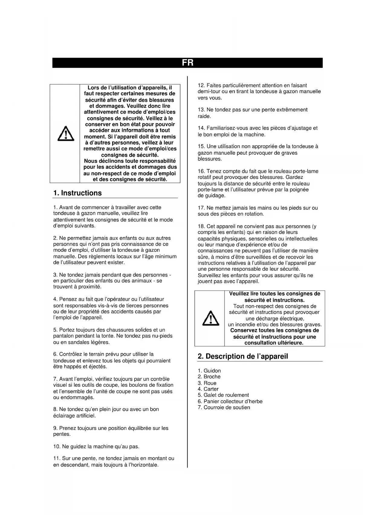 - Avant de commencer à travailler avec cette tondeuse à gazon manuelle, veuilles lire attentivement les consignes de sécurité et le mode d'emploi suivants.