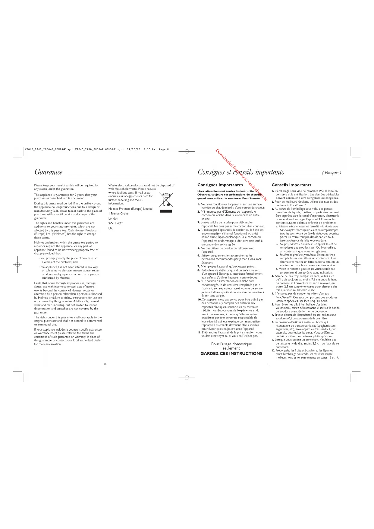 l’aliment ait fermenté ou dégagé des gaz. L’aliment risque d’être avarié, il faut le jeter. Le sac fond: Quand le sac fond, c’est sans doute parce que la bande de soudure est devenue trop chaude. Laissez toujours écouler 20 secondes entre les opérations pour que l’appareil refroidisse. Garantie Veuillez conserver votre ticket de caisse, il vous sera demandé lors de toute réclamation sous garantie. Cet appareil est garanti 2 ans à partir de la date d’achat, comme indiqué dans le présent document. Dans le cas peu probable d’une panne résultant d’un défaut de conception ou de fabrication au cours de la période de garantie, veuillez rapporter l’appareil au magasin où vous l’avez acheté avec votre ticket de caisse et une copie de cette garantie. Vos droits statutaires ne sont aucunement affectés par cette garantie. Seul Holmes Products (Europe) Ltd. (« Holmes ») peut modifier ces dispositions. Holmes s’engage à réparer ou remplacer gratuitement, pendant la période de garantie, toute pièce de l’appareil qui se révèle défectueuse sous réserve que :